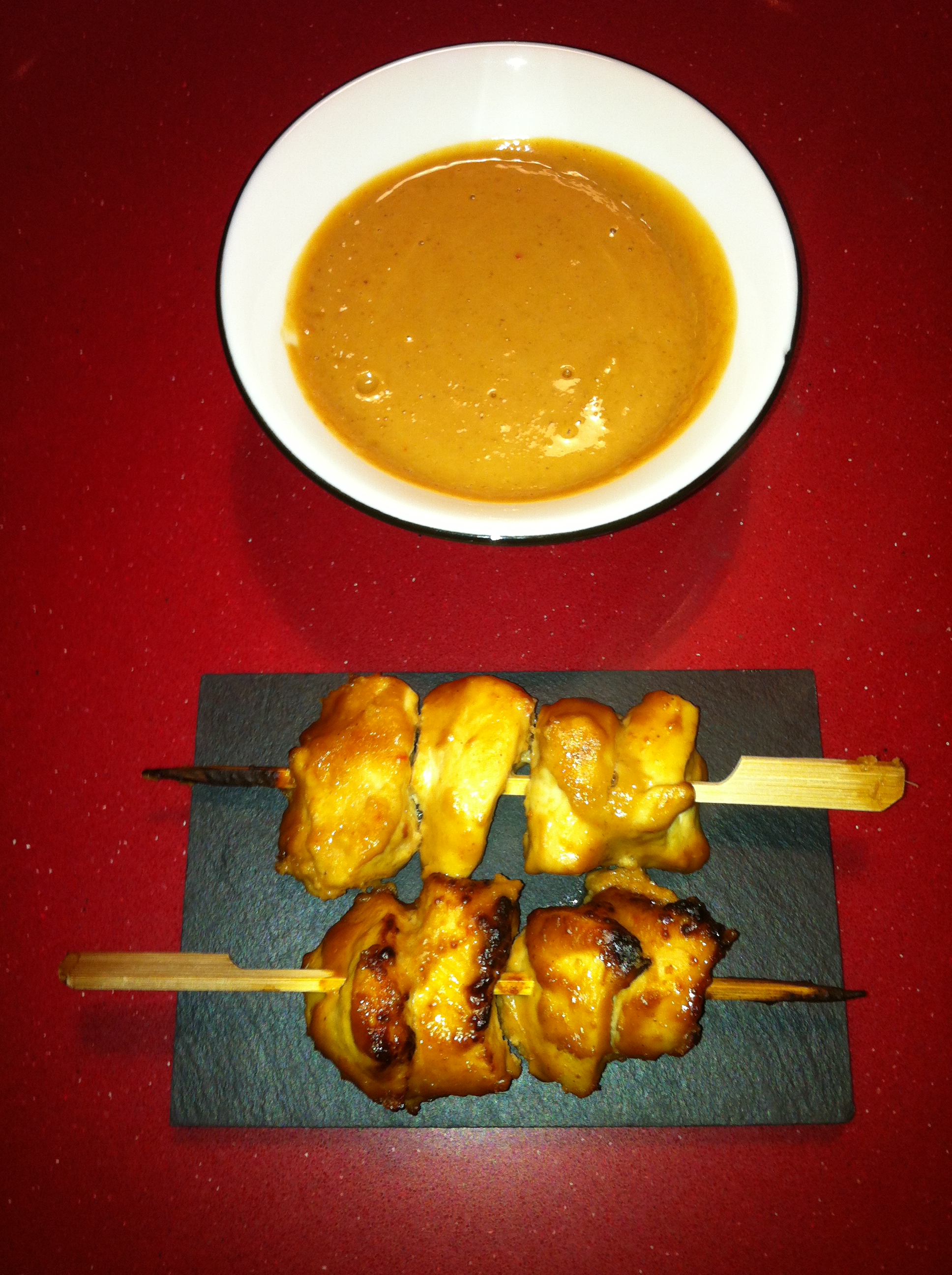3 o 4 pechugas de pollo enteras, 2 dientes de ajo, 20grs de jenjibre fresco, 1cl de salsa de pescado, 3cl de salsa de soja, 20grs de miel, 120grs de manteca de cacahuete, 1 thai chili picado, 2cl de zumo de lima, 7cl de leche de coco y sal