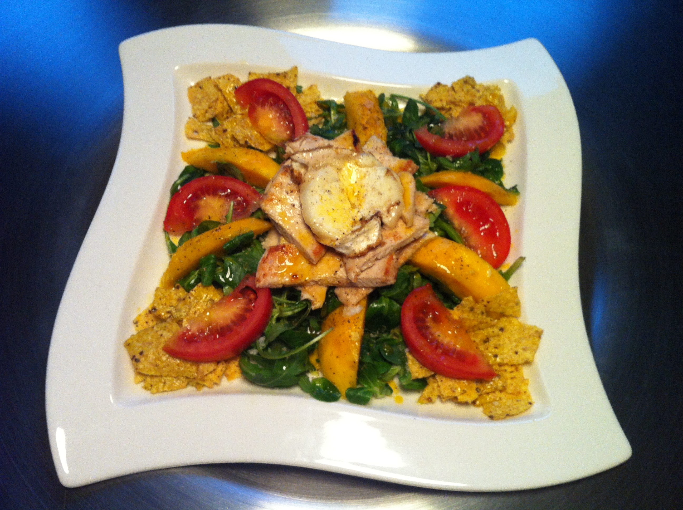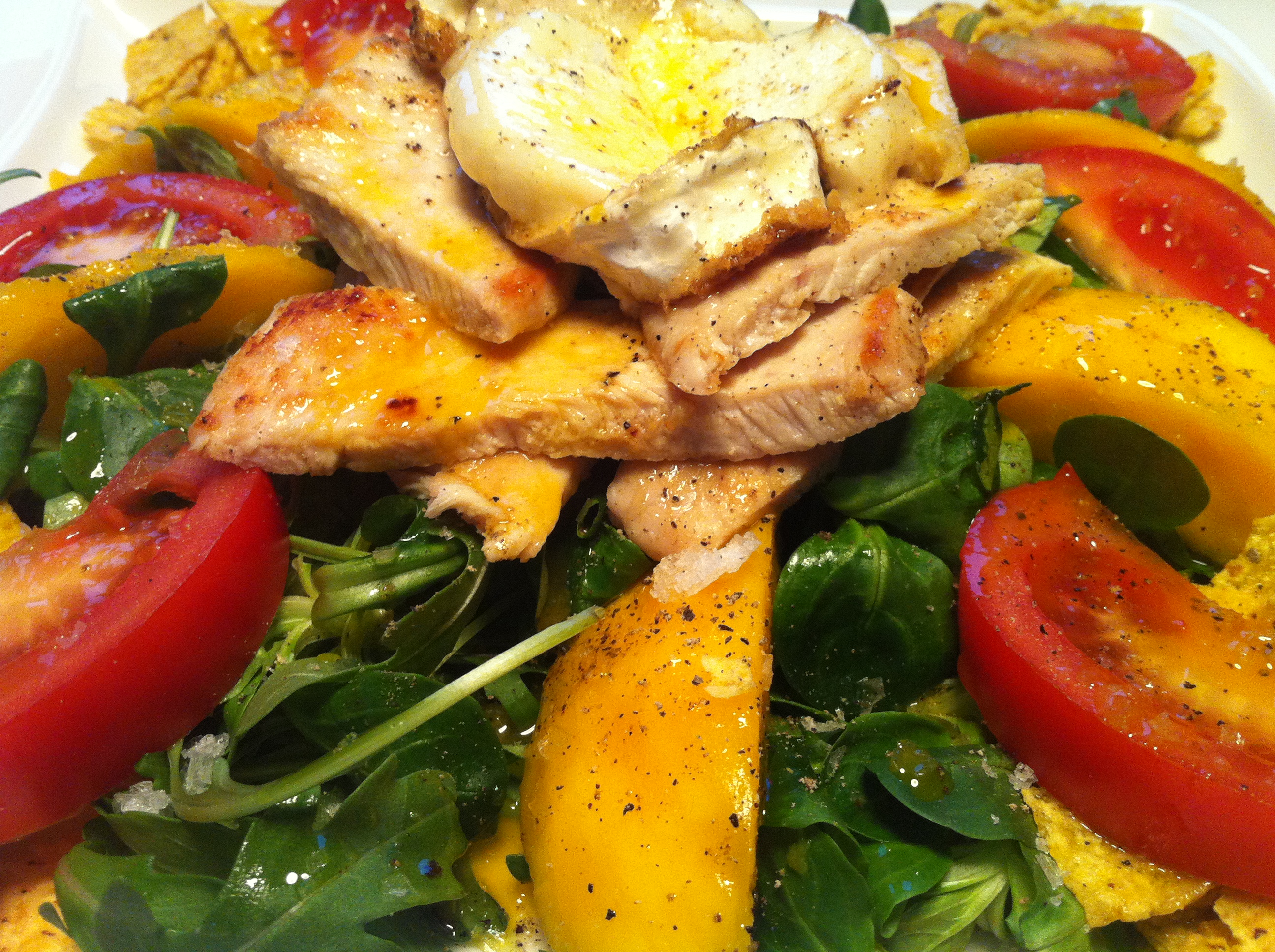 2 filetes de pollo, 1 mango, un trozo de rulo de queso de cabra, 1 tomate, una bolsa de canónigos y rúcula, tortilla chips, aceite de oliva, vinagre de mango, pimienta y sal en escamas.