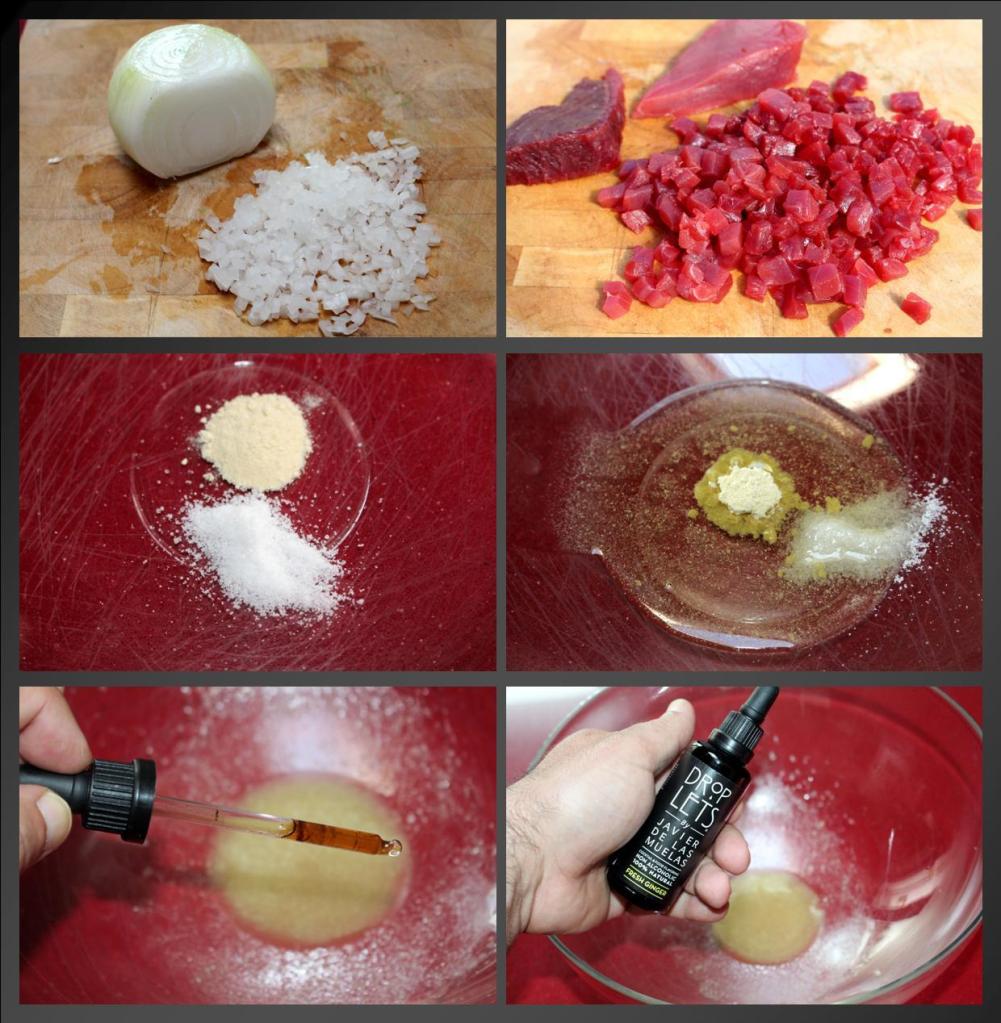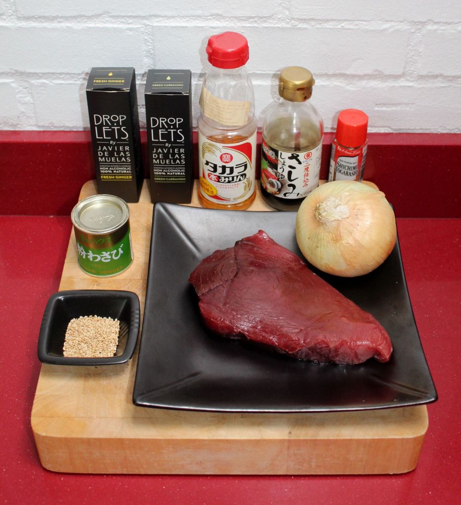 250grs de atún rojo, 1/4 de cebolla, 1 cucharadita de café de polvo de wasabi, 2 cucharadas soperas de soja, 1 cda. sopera de mirin, 1 cuchara de postre de AOVE, 1 pizca de sal, 5 gotas de concentrado de jengibre o una cda de postre de jugo extraído de la raíz, 3 gotas de concentrado de cardamomo o 2 vainas trituradas, semillas de sésamo y shichimi togarashi al gusto.