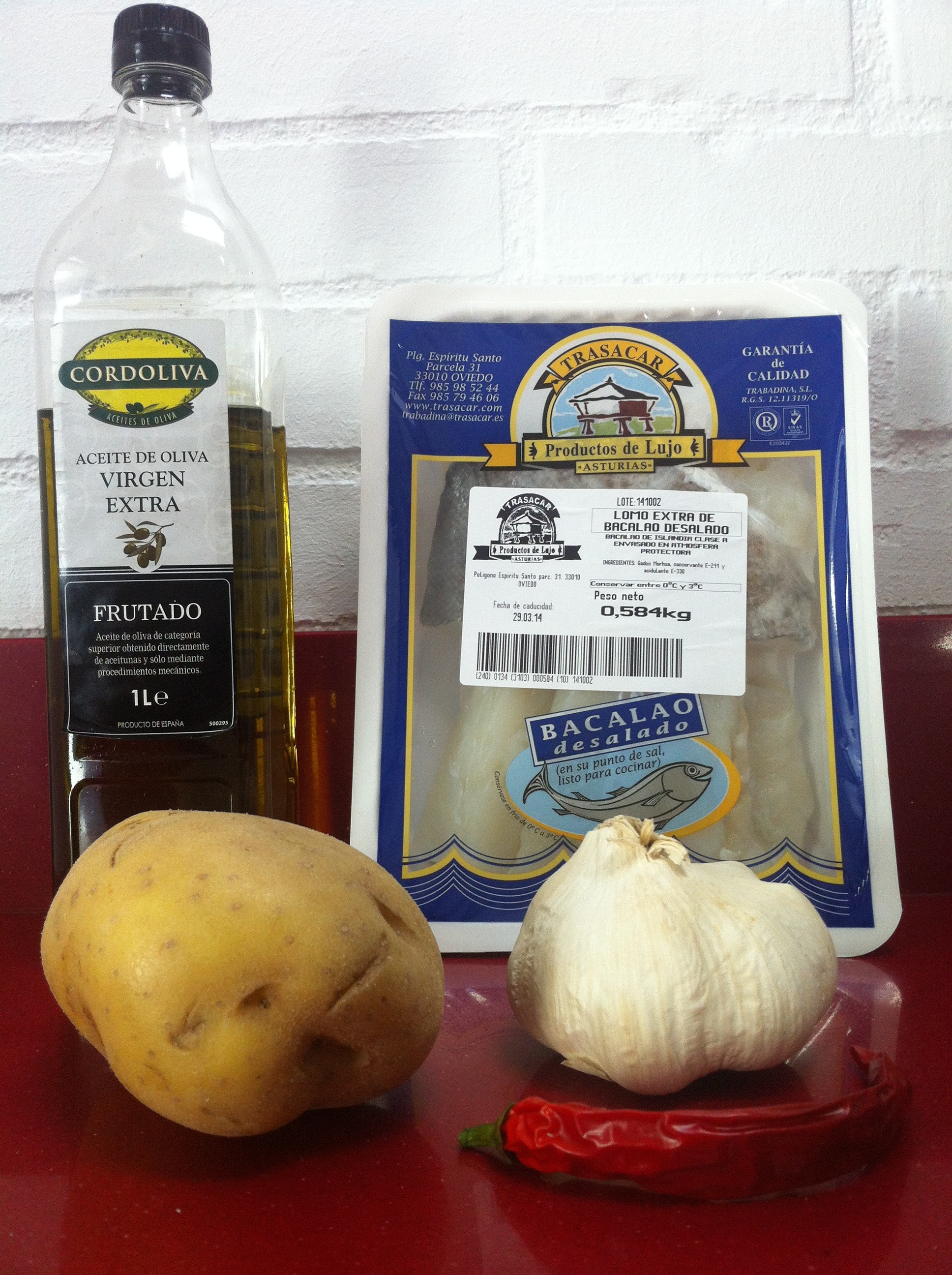 1 lomo de bacalao desalado 300grs aproximadamente, 250ml de aceite de oliva (el aceite es el de Cazorla pero lo trasvaso de la lata de 5L a este otro envase más manejable), 3 dientes de ajo, 1 guindilla, 1 patata.