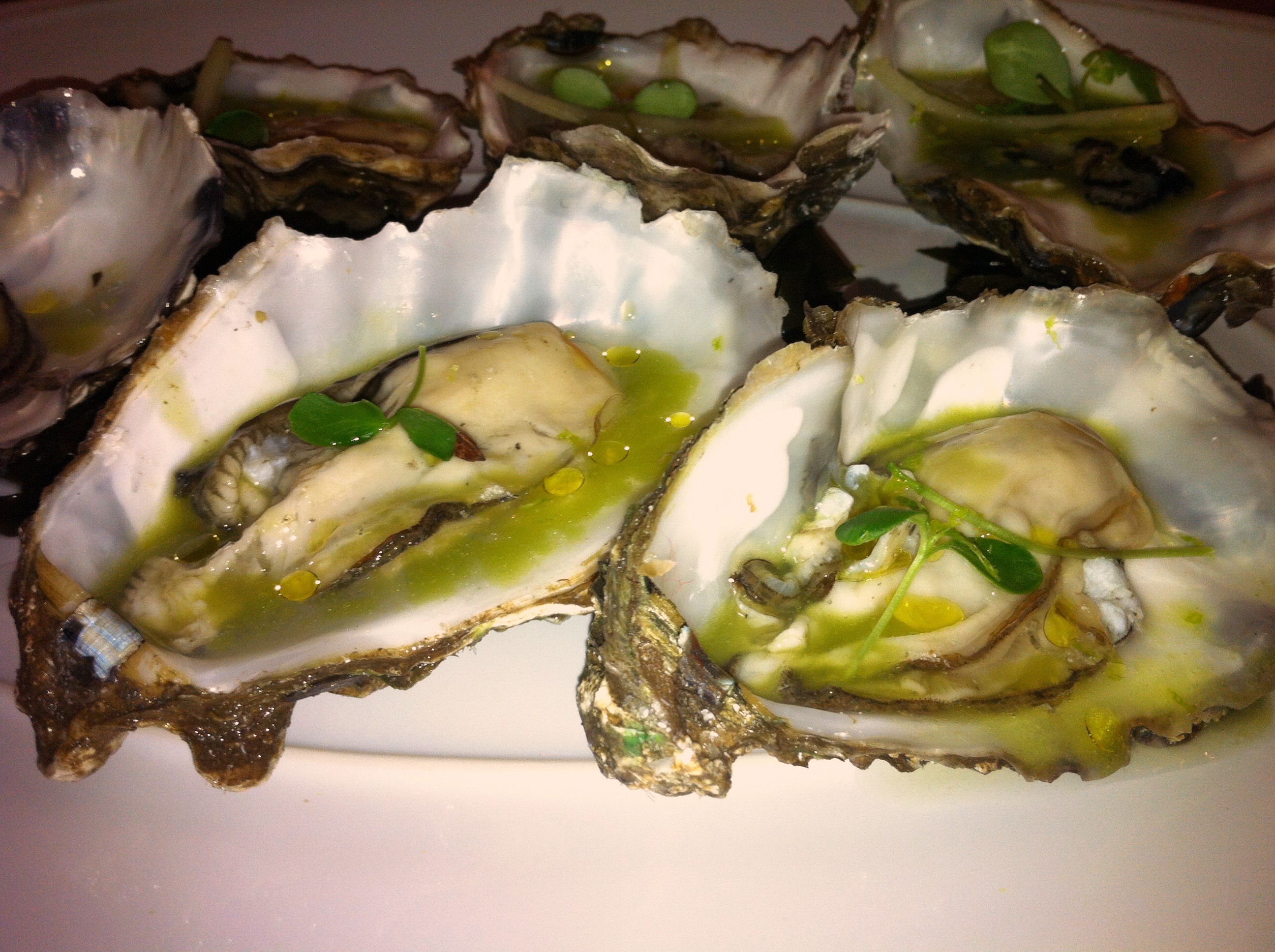 A continuación me sirvieron las ostras, tres de ellas sin aderezo y otras tres con un agua de pepino y manzana. Tuve miedo de que este me matara el sabor y el frescor pero ahora me arrepiento de no haberlas pedido todas con el aliño. Muy carnosas y buen calibre.