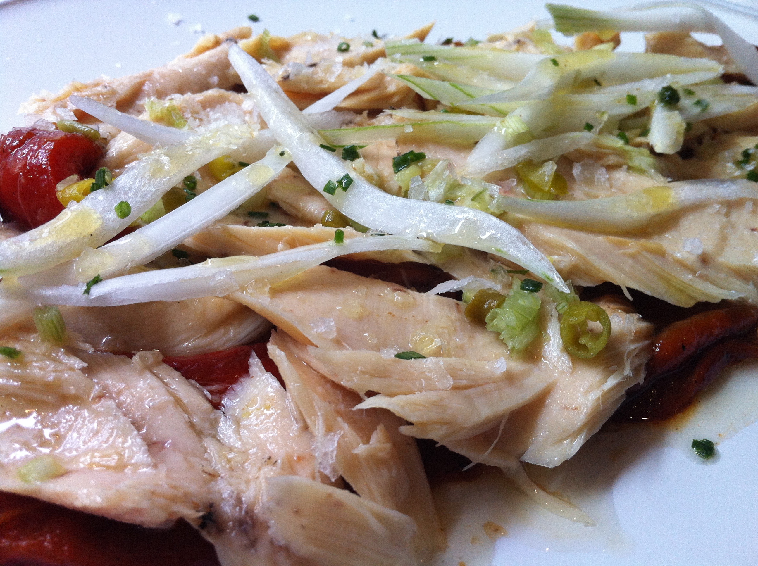 Comencé con la ensalada de la que destaco el buen bonito y el grosor y el perfecto punto de asado de los pimientos, al dente.