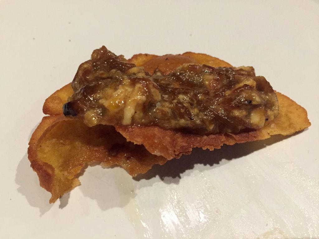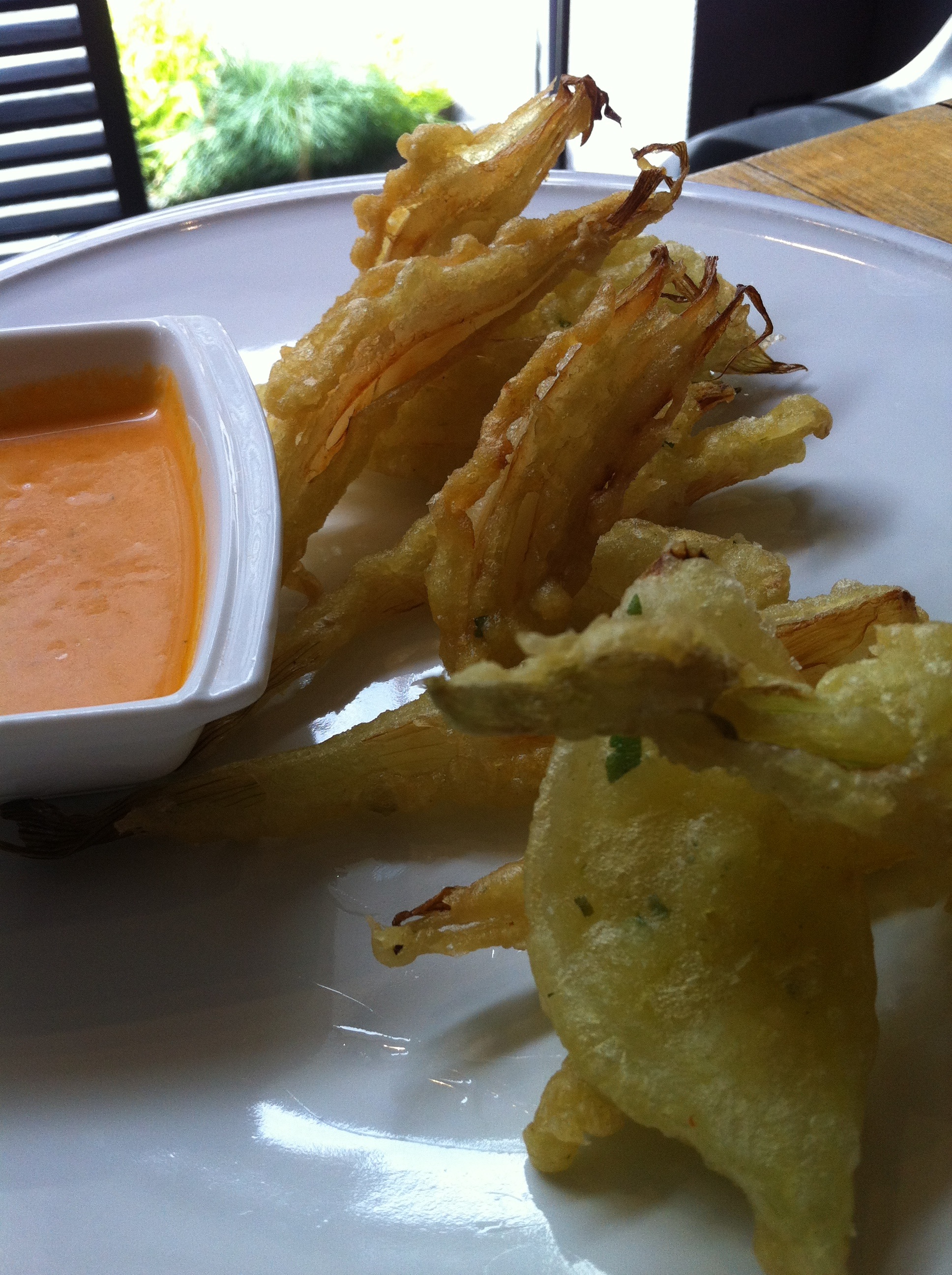 Llegó el turno de las cebolletas, me resultaron algo pesadas, hoy no era mi día para frituras, se me estropeó la nevera y había tenido que comerme de una sentada un solomillo de buey de medio kilo de Trasacar. Venían acompañadas de un salmorejo muy rico.