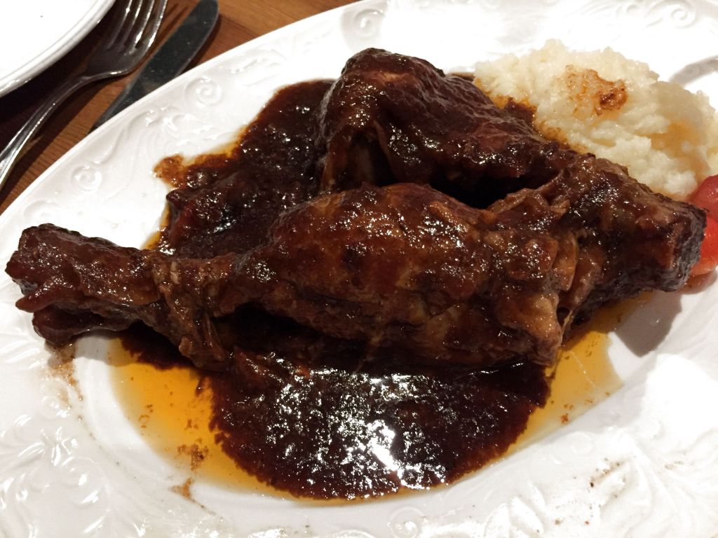 Jarrete de lechal, puré de patatas y hierbas.