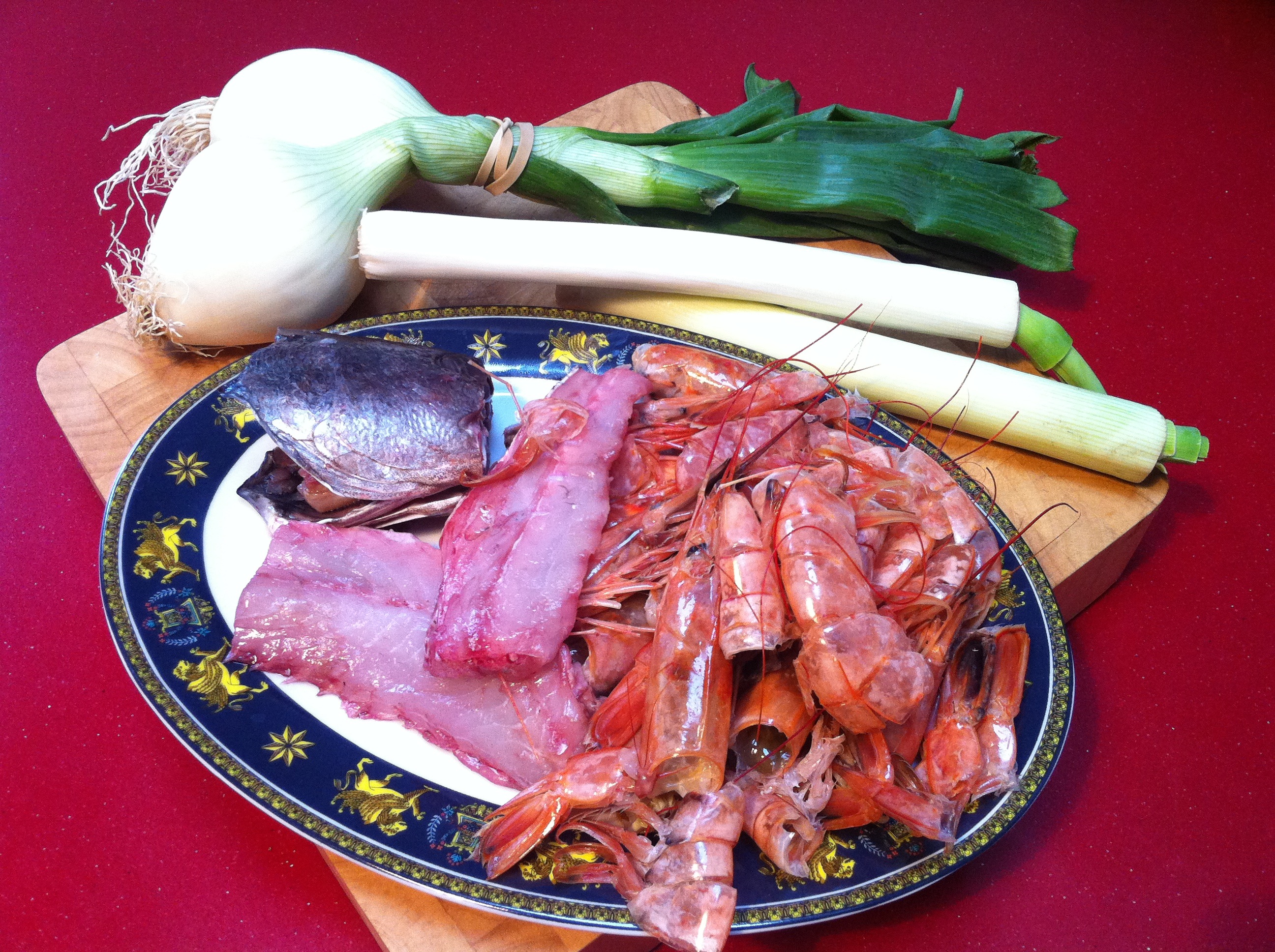 Cabeza y espinas de una Corvina, cabeza y cascaras de una docena de gambones, 1 ajo puerro, los tallos de dos cebolletas, agua y sal.