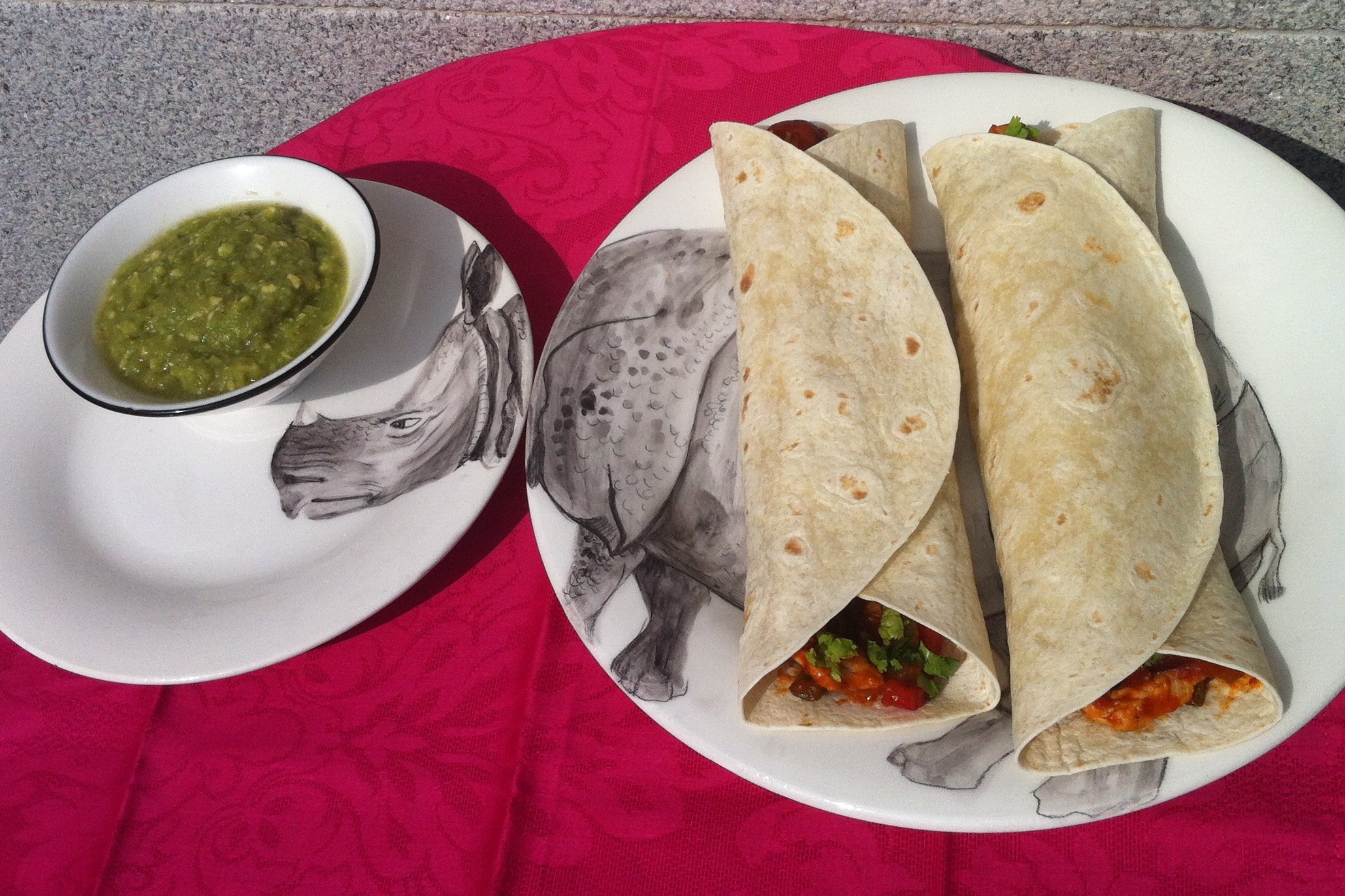 Metemos las tortillas en el microondas, a 800w unos 30 segundos, ponemos el relleno a lo largo en el centro y envolvemos, acompañamos de guacamole y a mancharse los dedos se ha dicho.