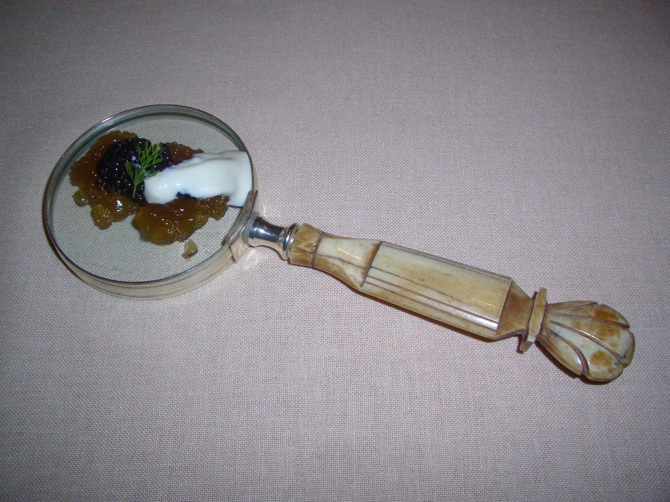 Un paño de croché adherido a una emulsión de Chipirón con tartar del mismo y Mozarella ahumada, es un espectáculo de diseño en un plato, pude ver como tenían preparadas las laminas que separaban se su papel, a saber como se hace.