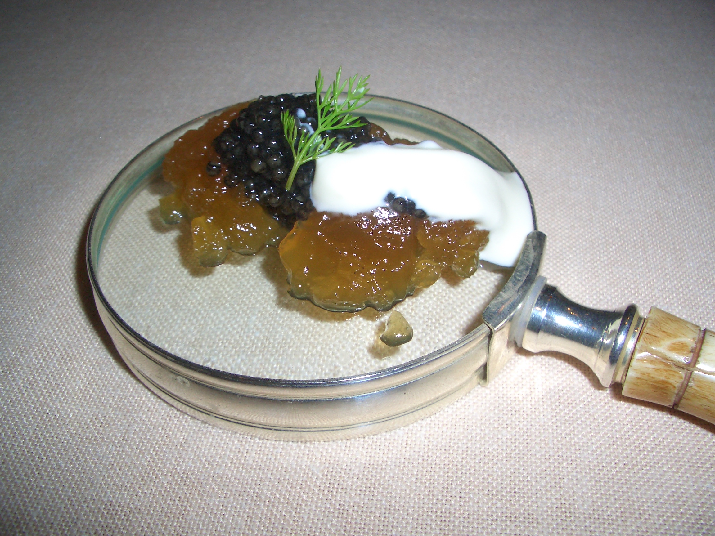 Cualquiera diría que esto es un puchero, si, lo es pero gelificado con caviar de Riofrío. La presentación es espectacular.