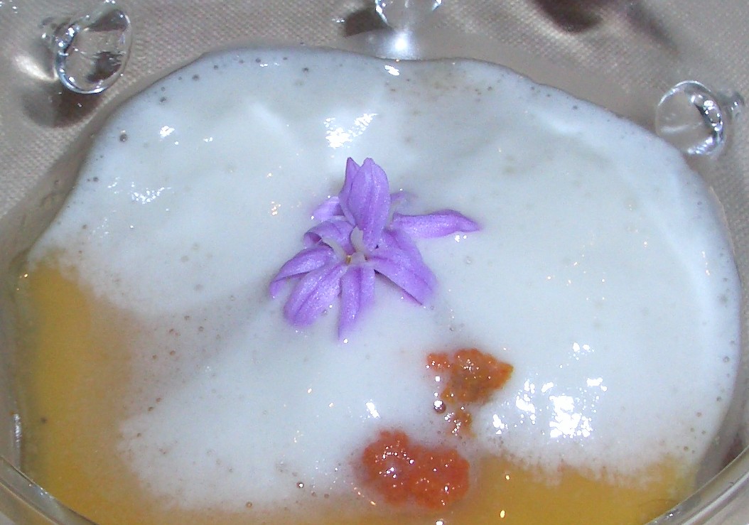 El siguiente me gusto mucho, el caramelo de erizo y lichi hacía un contraste muy interesante con el ajoblanco y el recipiente como si de un erizo de cristal se tratase.