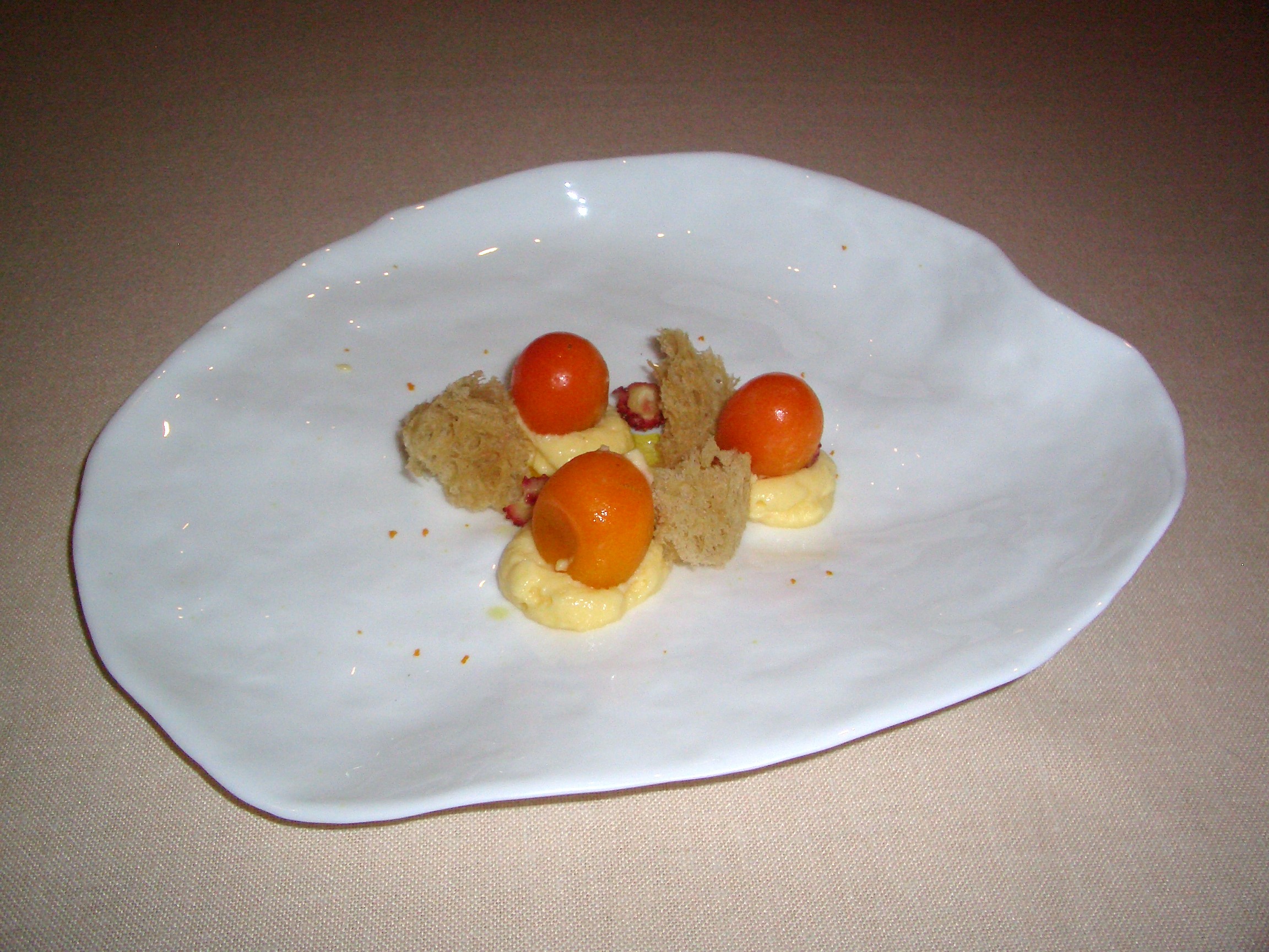 Nos sirven el tomate nitro moruno, una de sus afamadas creaciones, servido muy frío destaco del plato los toques cítricos y el espectacular brillo.