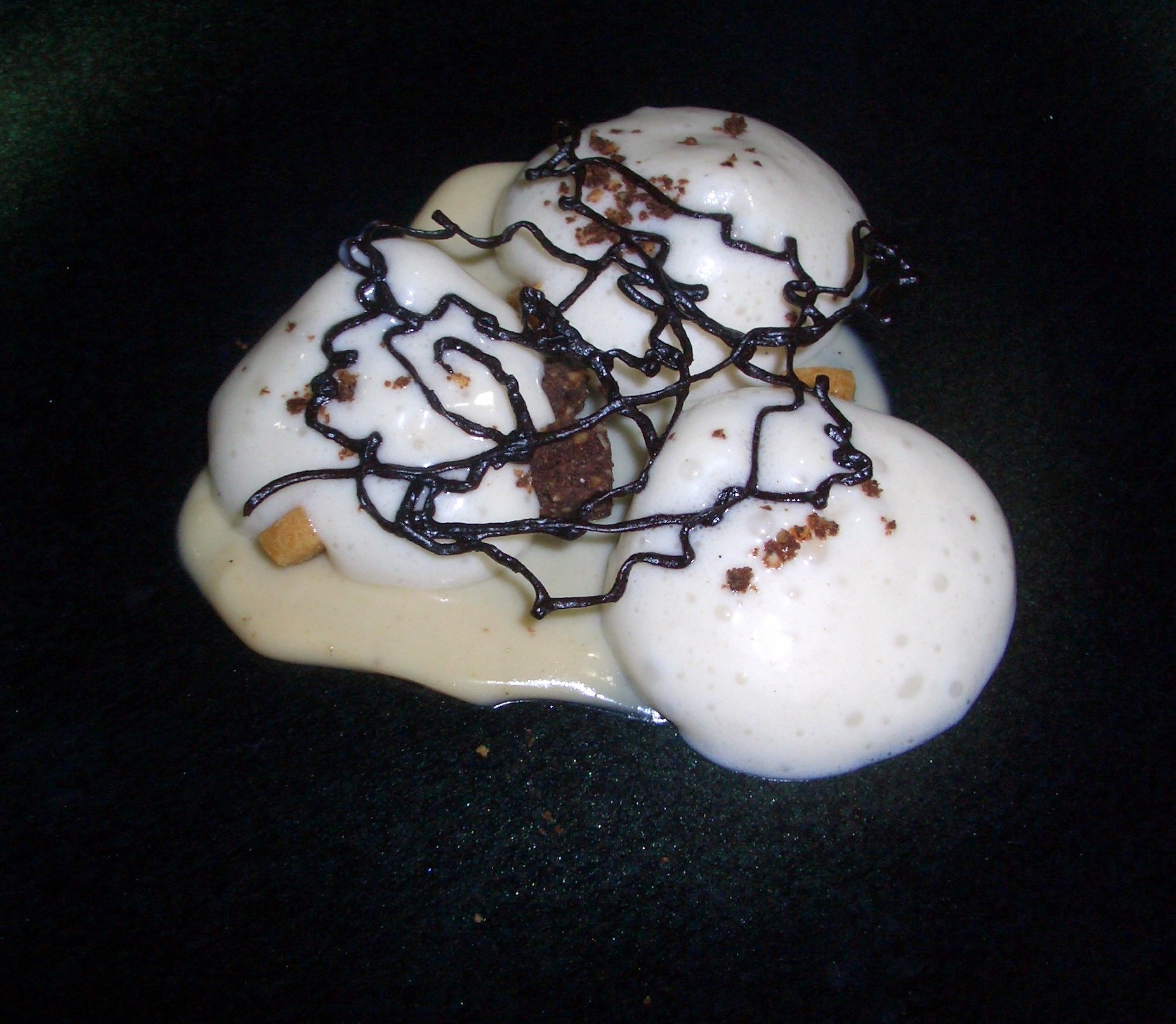 Llego la hora del Deja Vú, el nombre nos indica que se trata de algo que ya hemos vivido y el camarero me traslada que me recordará a algo de mi infancia pero sin querer darme más detalles para que sea uno mismo el que le saque los sabores. Efectivamente, me recordó a los potitos y luego me explico que emulaba a las papillas, en este caso con 5 cereales y sorbete de mango, precisamente este fue el que me despistó un poco, creo que si se hubiese elegido el plátano no hubiese tenido equivocación alguna.