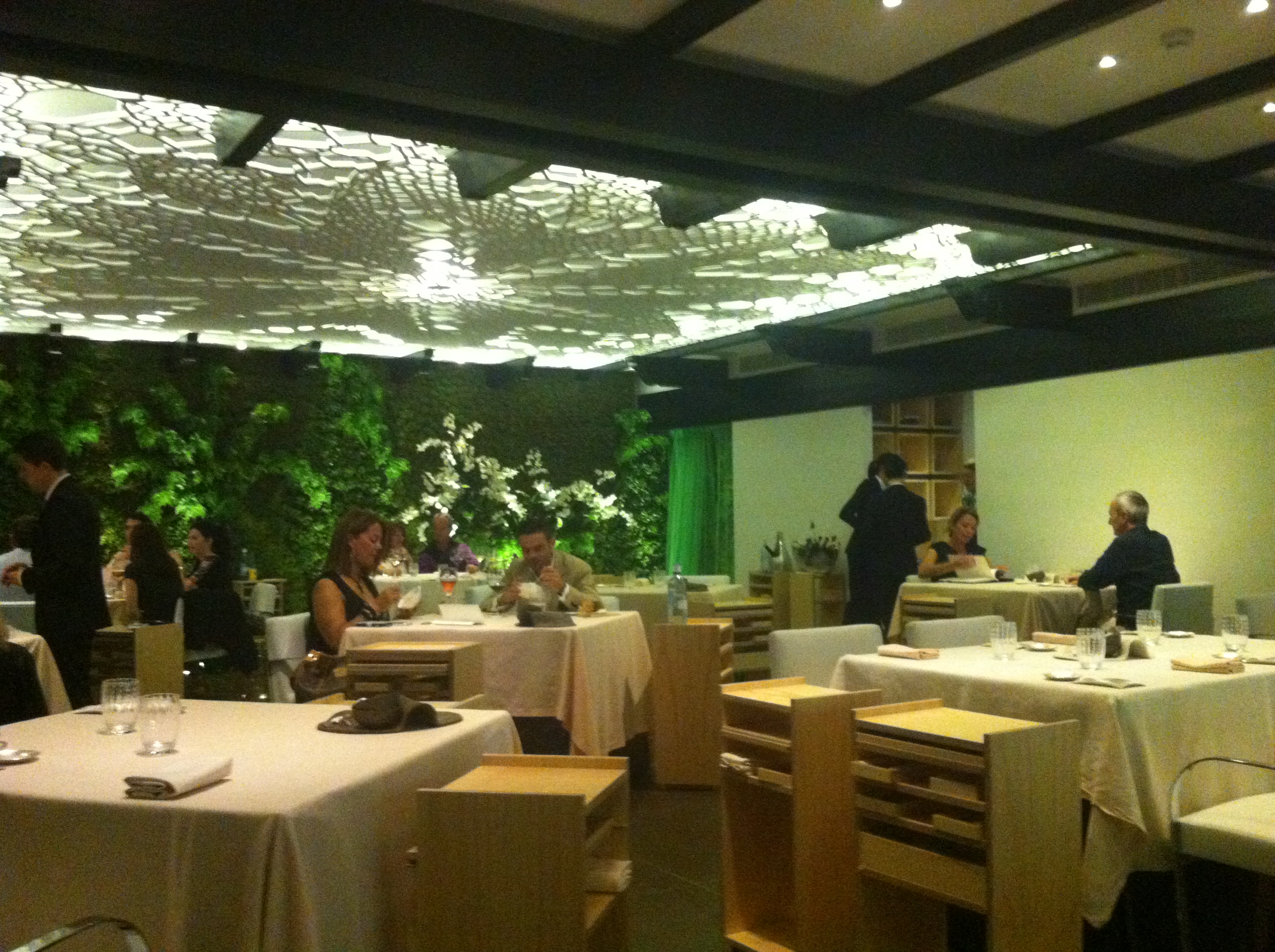 El entorno en el que se ubica el restaurante es muy agradable, cuenta con dos entradas, yo accedí por una con un gran luminoso con vegetación y una preciosa vitrina expositora con la carta nos indican que estamos ante algo diferente, bajamos unas escaleras y a mano izquierda ya vislumbramos el restaurante, unas grandes cristaleras que en parte quedan protegidas por un croché en madera que confiere privacidad.