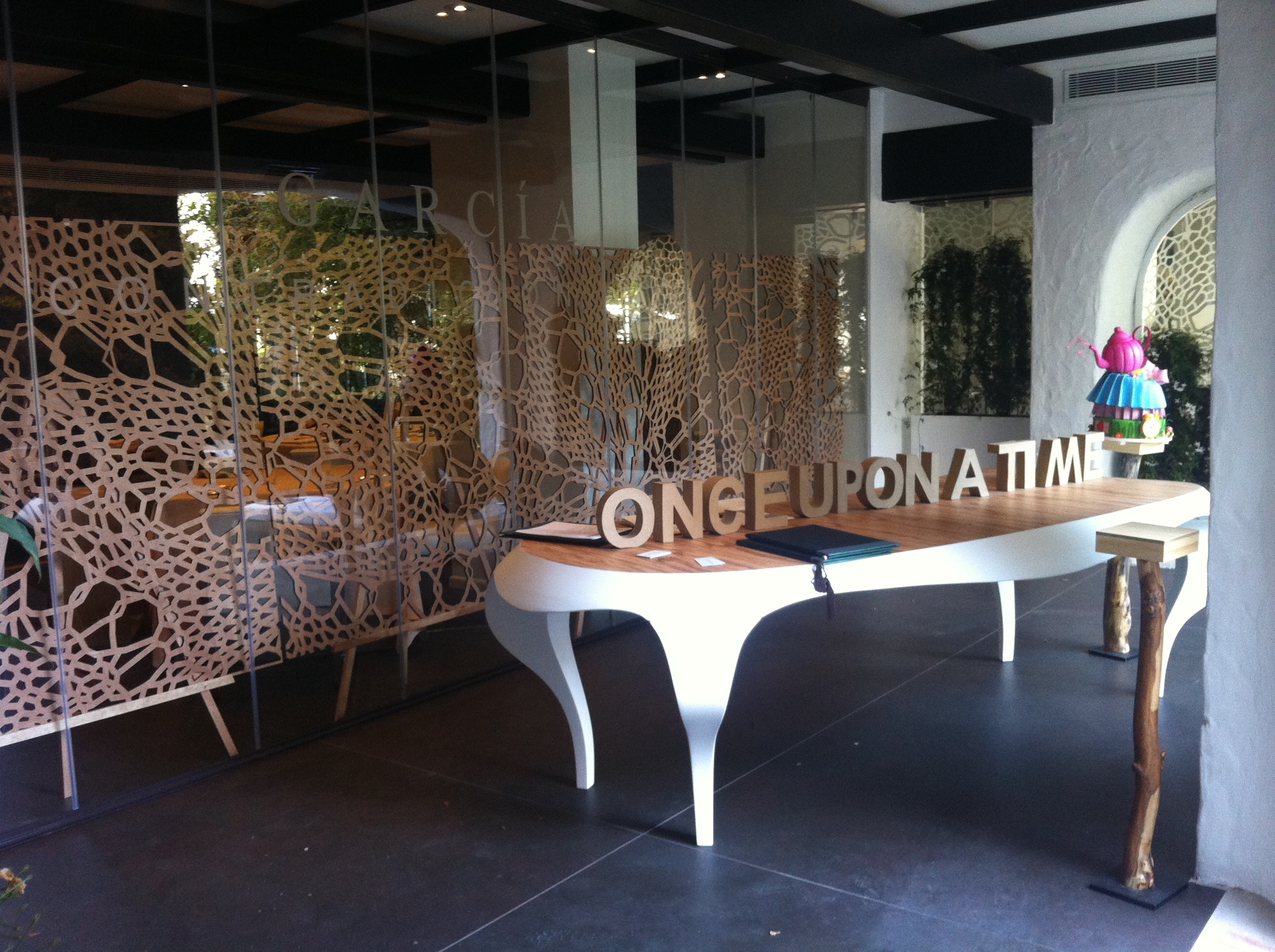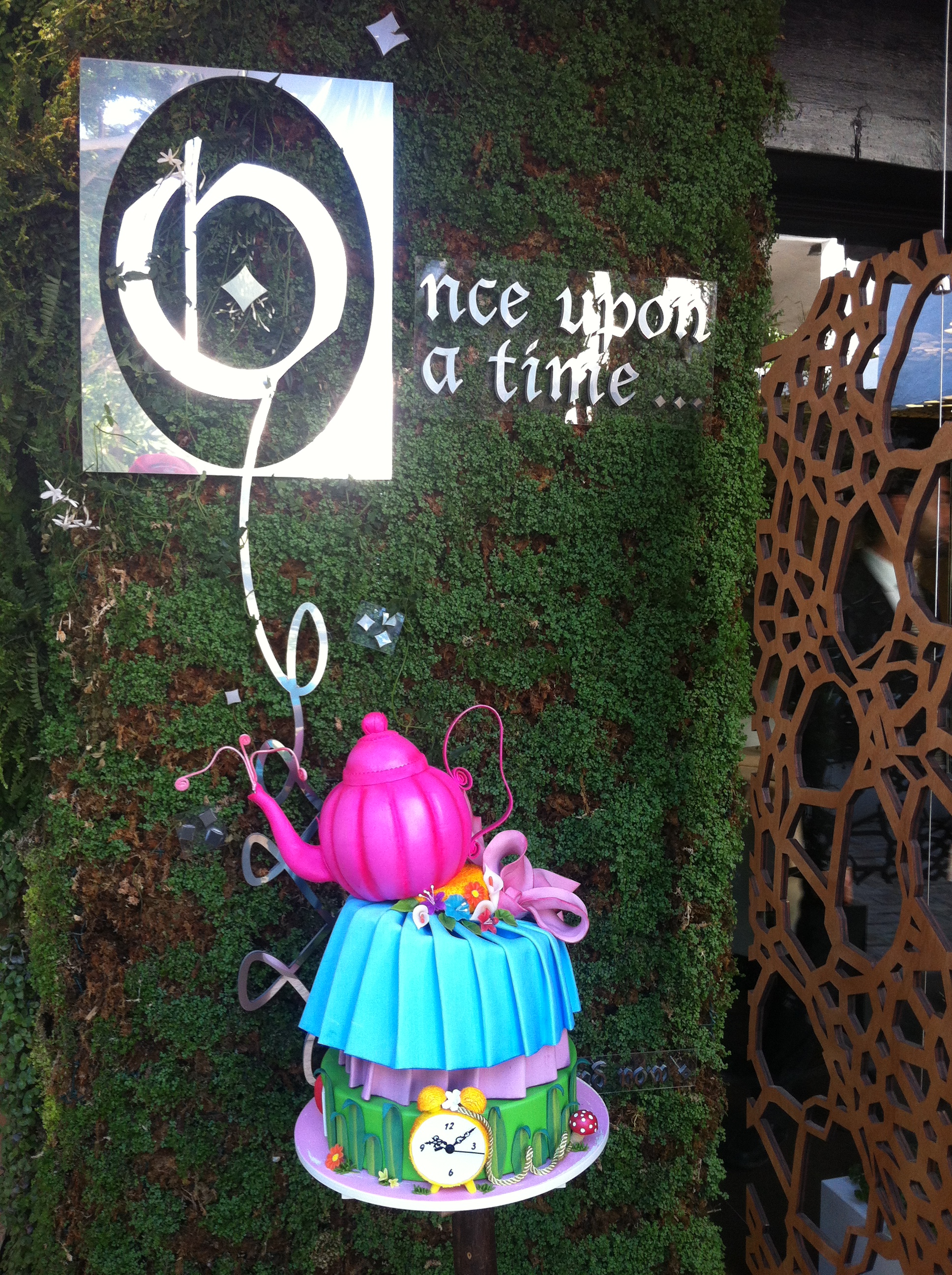 Una gran mesa alargada con la carta, tarjetas, unas figuras tridimensionales con el nombre de Once Upon a Time y una tarta con una gran tetera nos dan la bienvenida como si fuésemos Alicia en el País de las Maravillas antes de que una atenta señorita compruebe nuestra reserva.