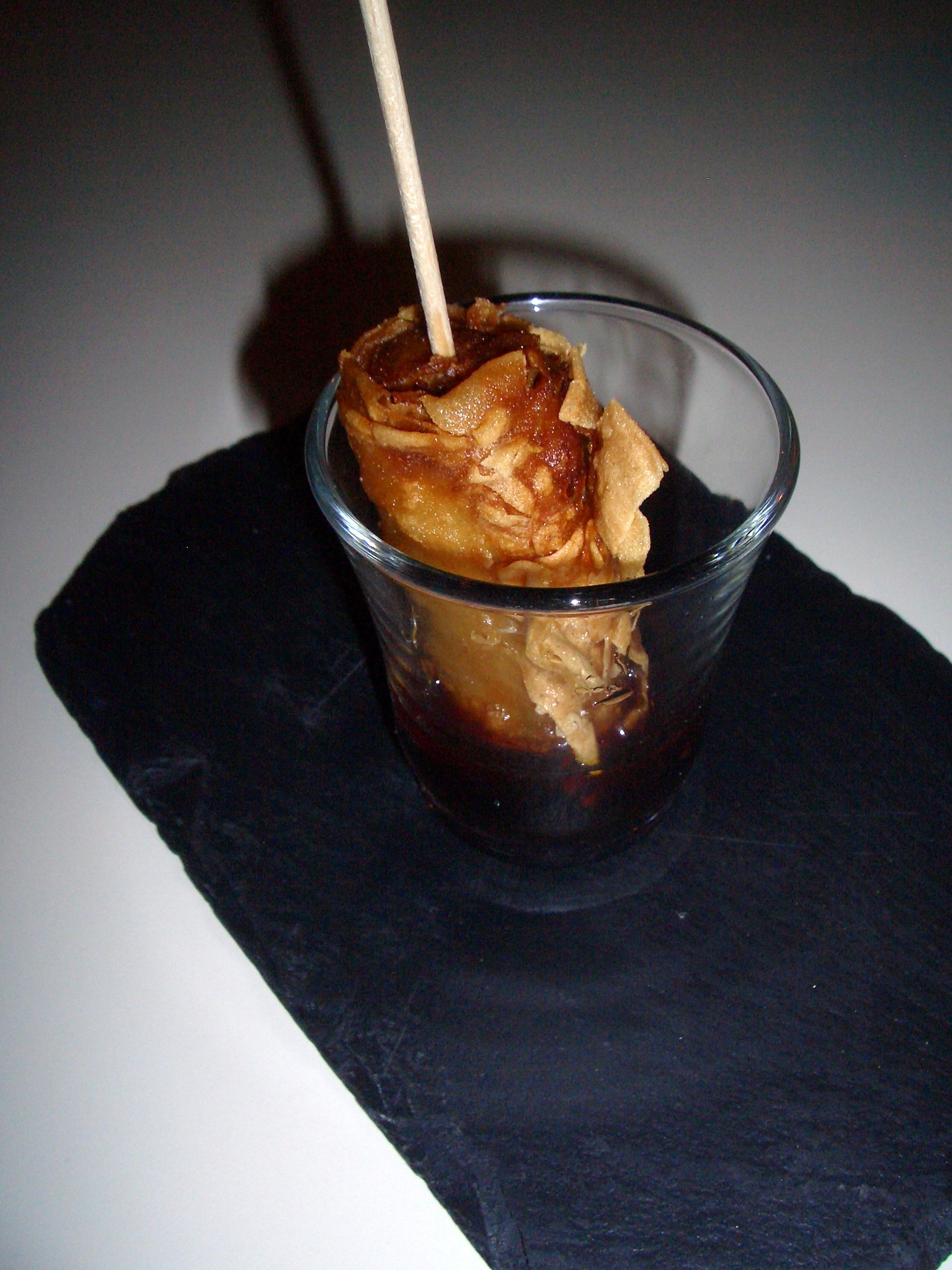 Decidido a dar un buen repaso a la carta comencé por la brocheta de pato crujiente con salsa Thai. Efectivamente, muy crujiente y con esa salsa sour sweet chili que tanto me gusta y que recientemente utilicé para mi Phad Thai.
