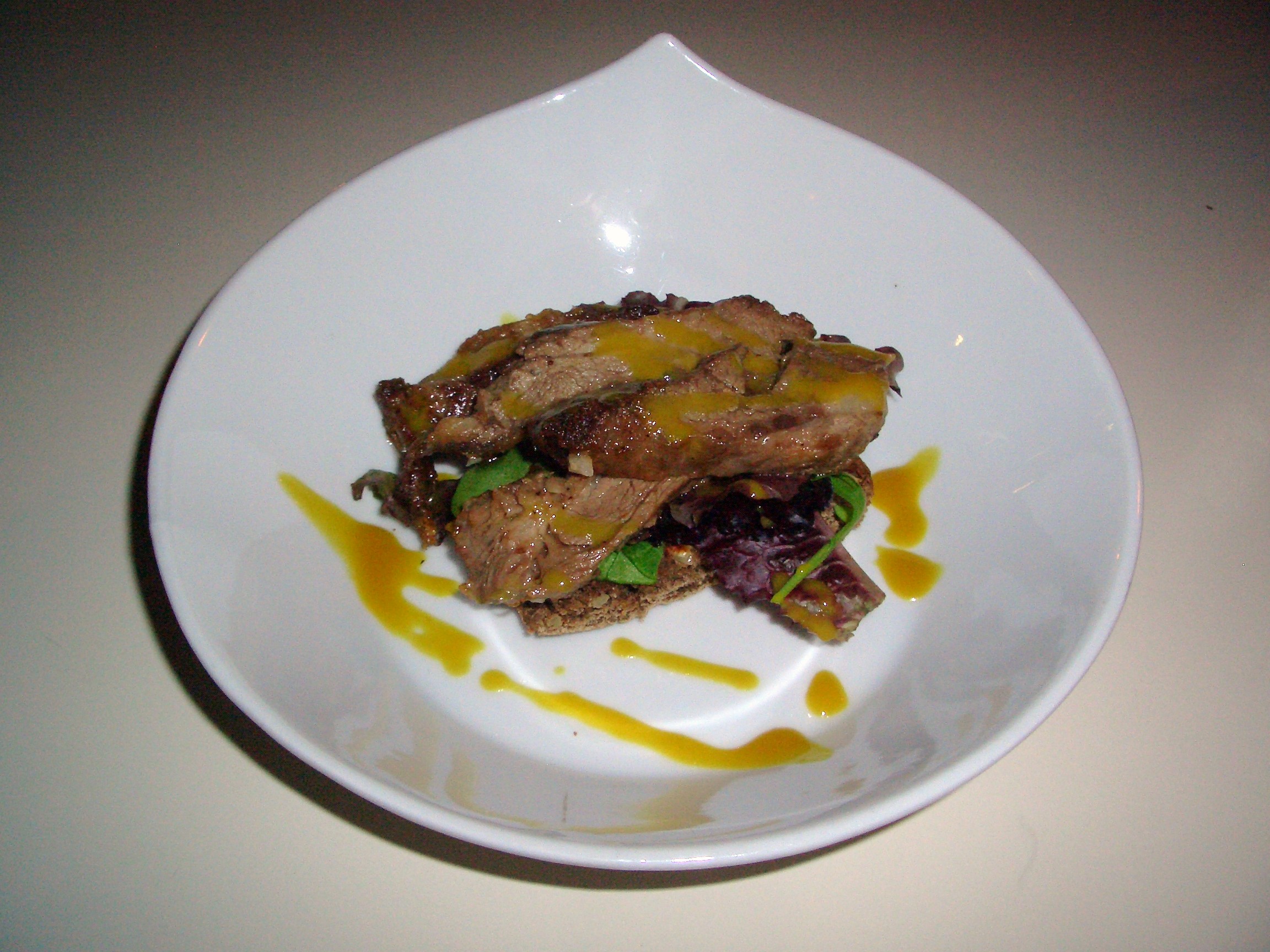 Continué con media tosta de pluma ibérica con tomates secos en aceite de oliva y salsa de mostaza de estragón. El consistente pan de semillas era el soporte ideal para unas sabrosas tiras de pluma con esa salsa que me gusta tanto.
