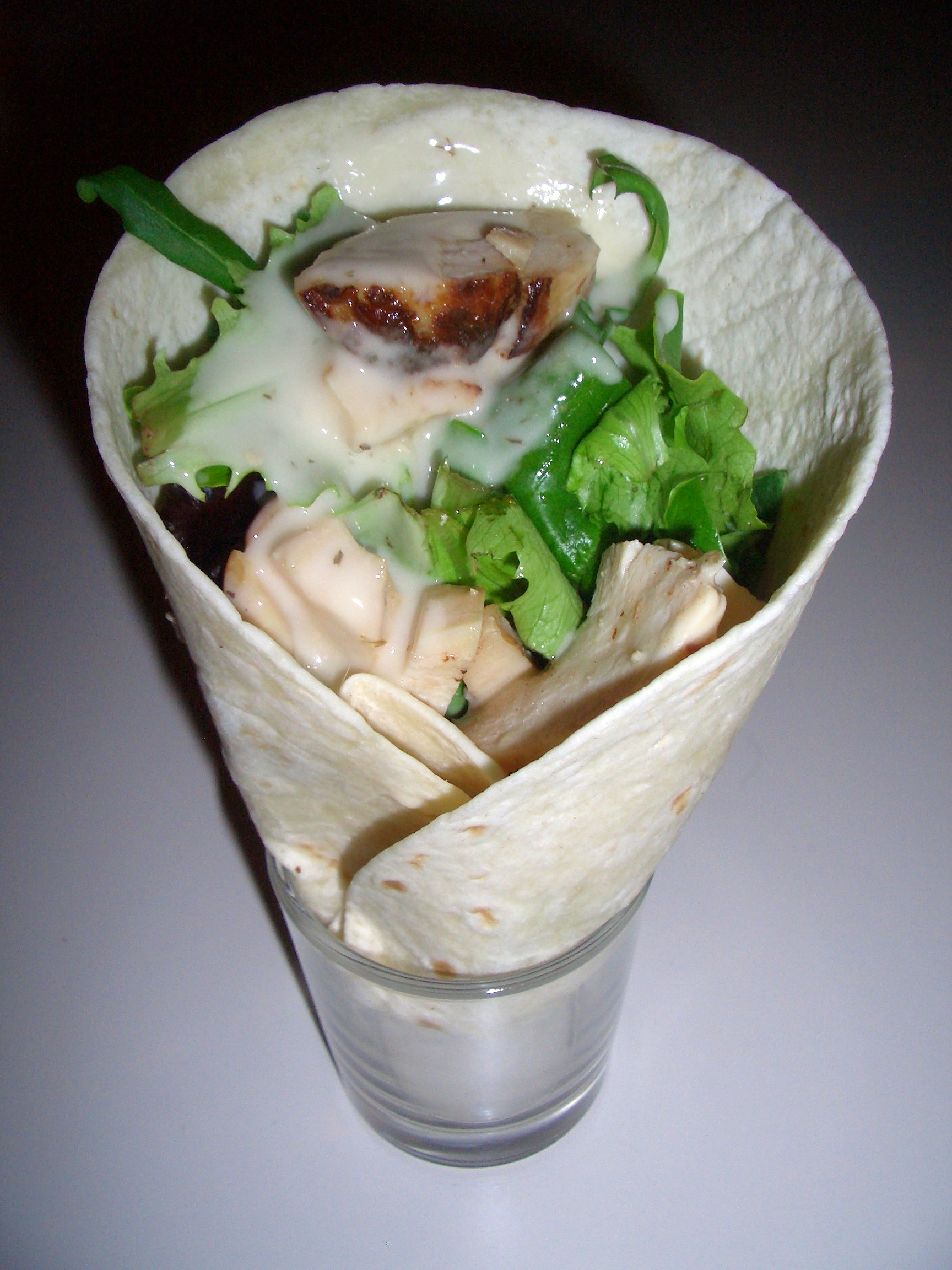 Un mini wrap frío de pollo con salsa de yogurt, algo ligero y fresco para aposentar el estomago.