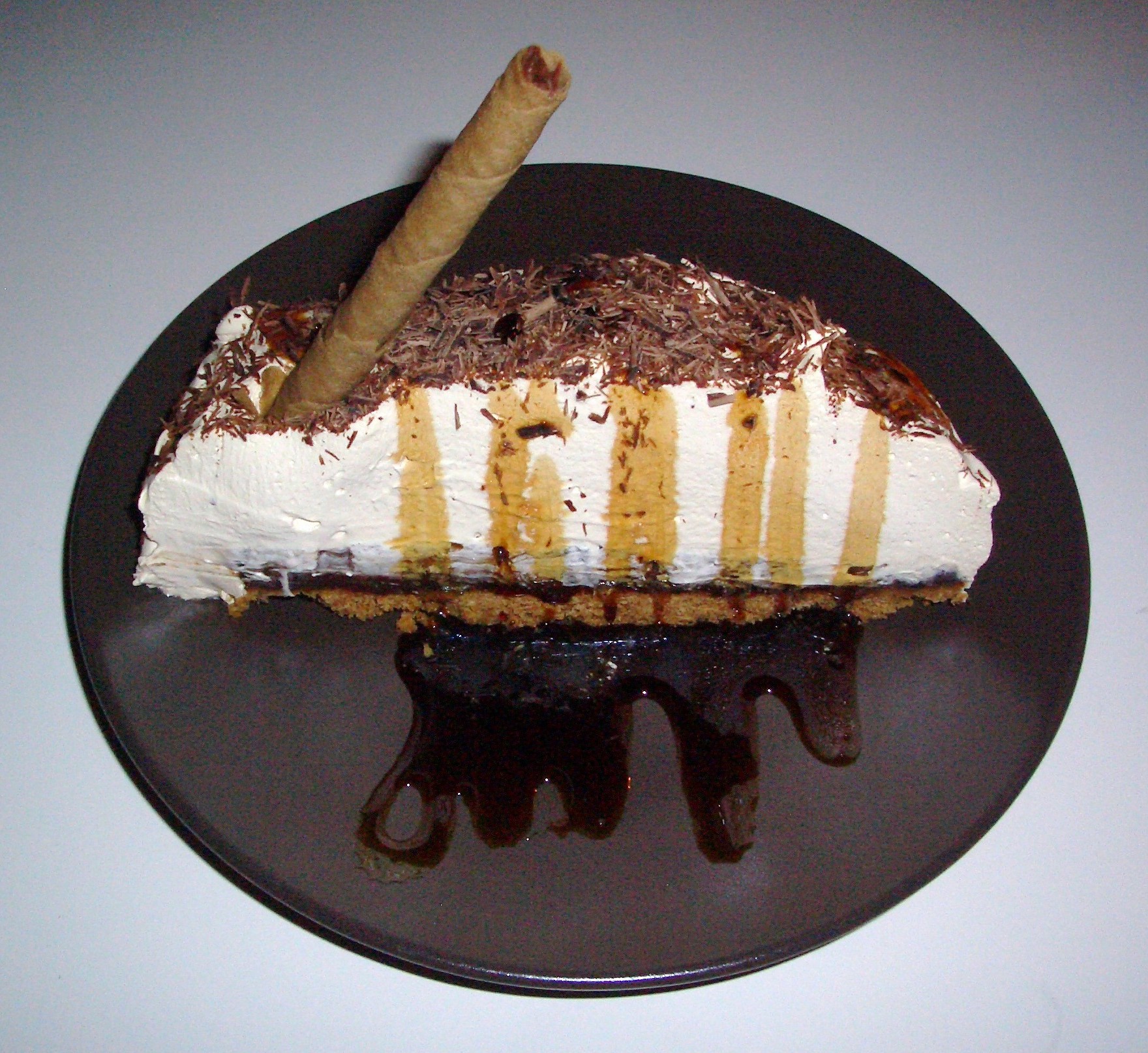 Para rematar la faena me aventuré con un postre, lo dejé a elección de Pilar, quería que me sorprendiera y vaya si lo hizo, me trajo una tarta de chocolate negro al ron con plátano y dulce de leche montado en la nata que había preparado ella. Contundente no, lo siguiente pero como bien me dijo es casero así que engorda menos, jajaja, que sentido del humor.
