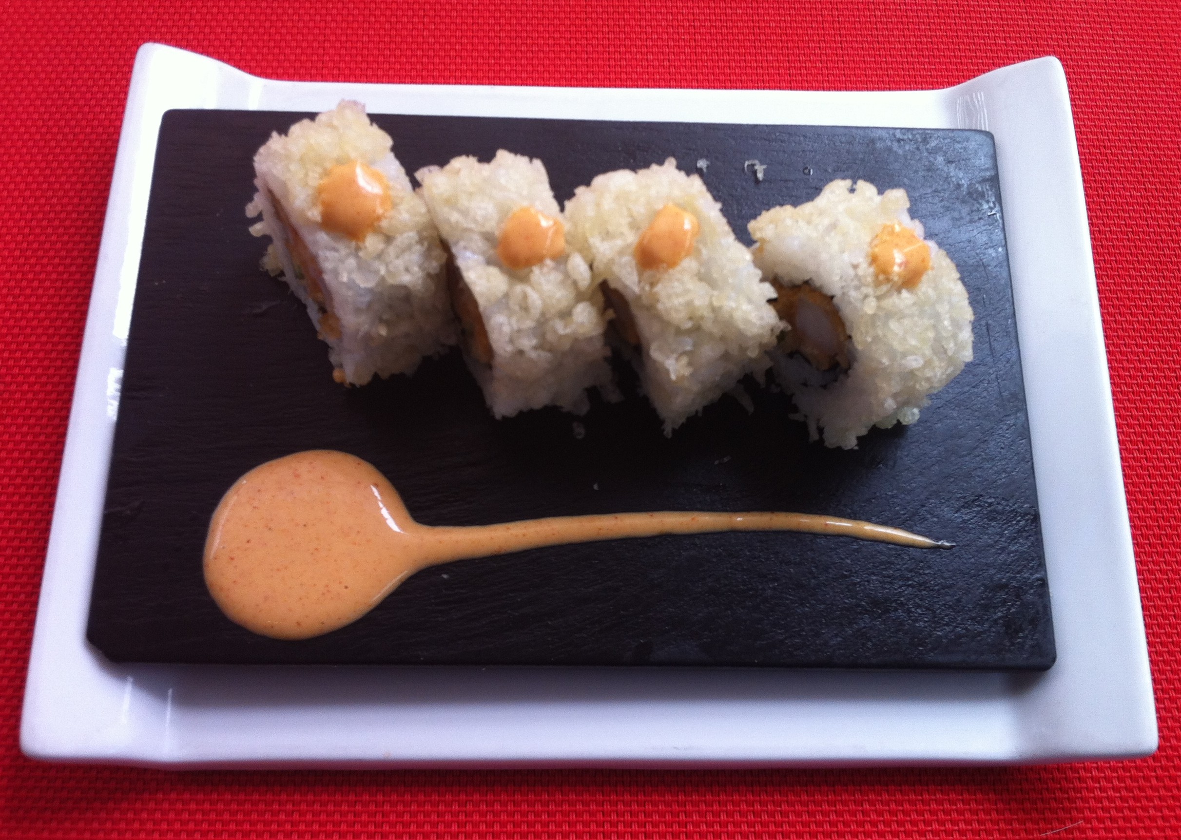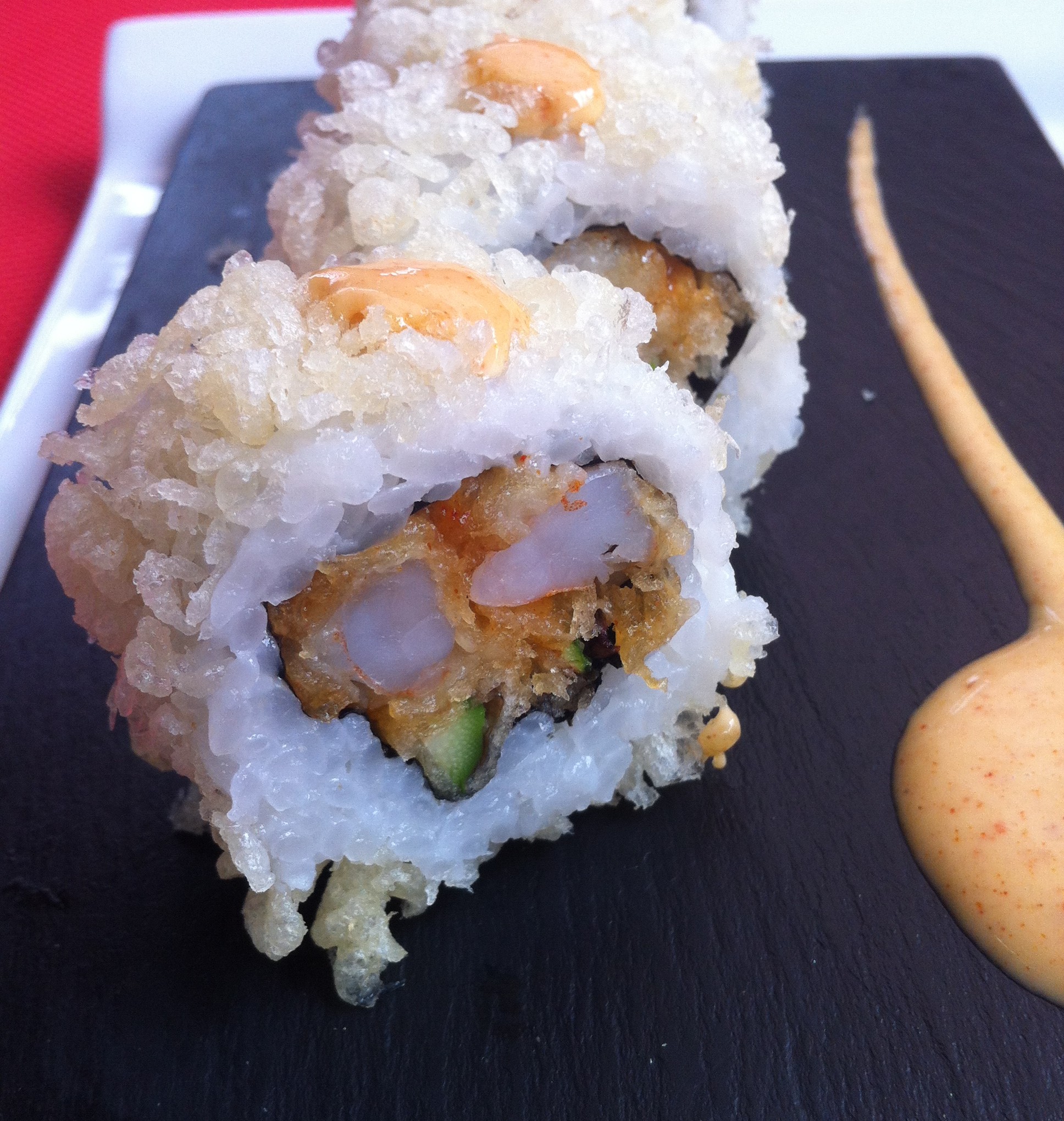 Llegó el esperado y recomendado tempura roll de langostinos y espárragos verdes en tempura, caliente, crujiente, una delicia y el perfecto remate para esta primera parte de la comida.