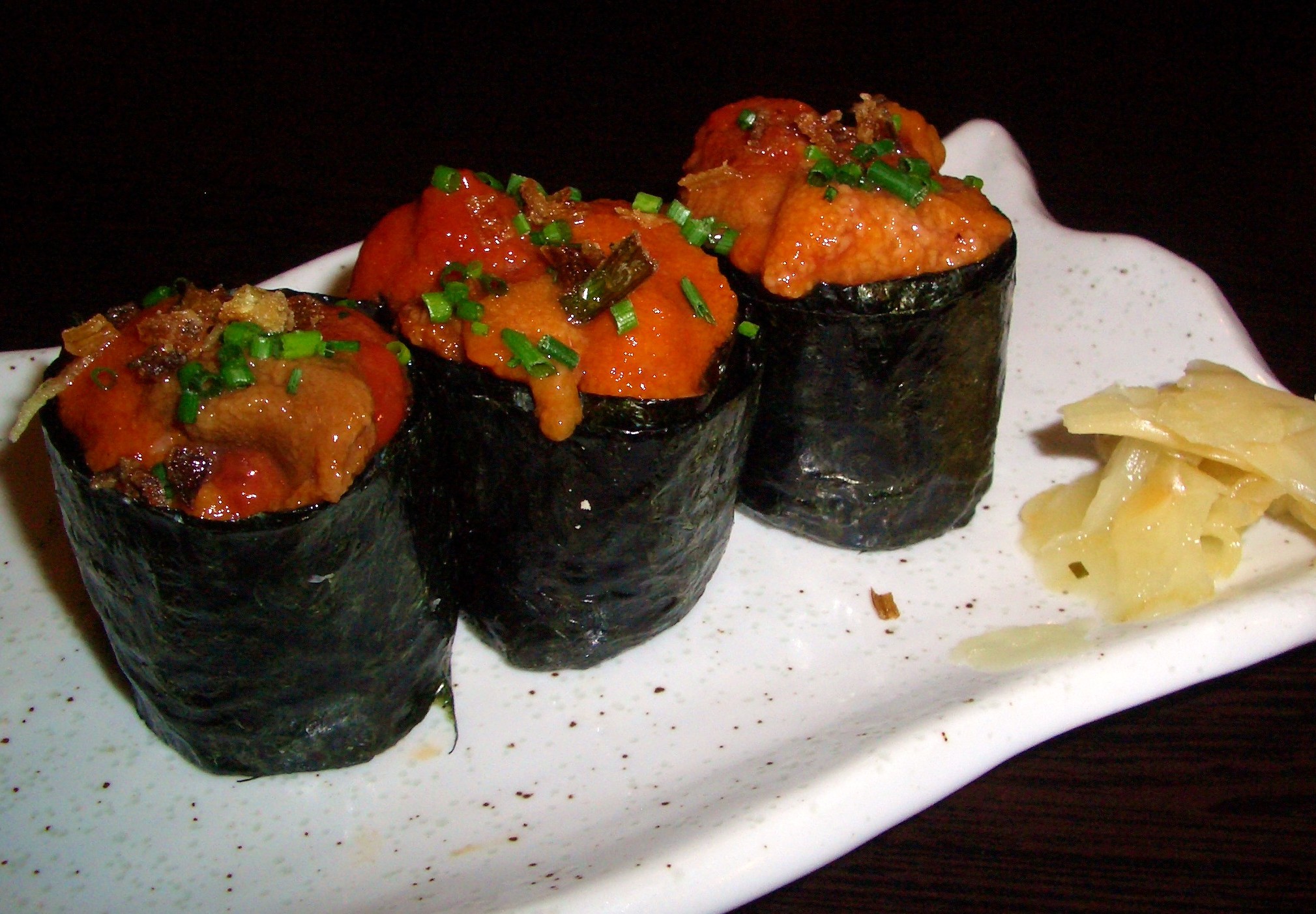 Pasamos ahora a la Ronda de sushi con los gunkan de oricios y los de tartar de vieiras al aji amarillo.