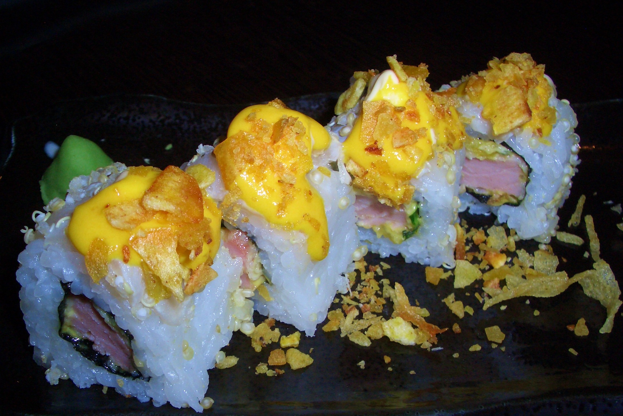 Roll de quinoa de pescados azules con crema de aji amarillo y crujiente de plátano.