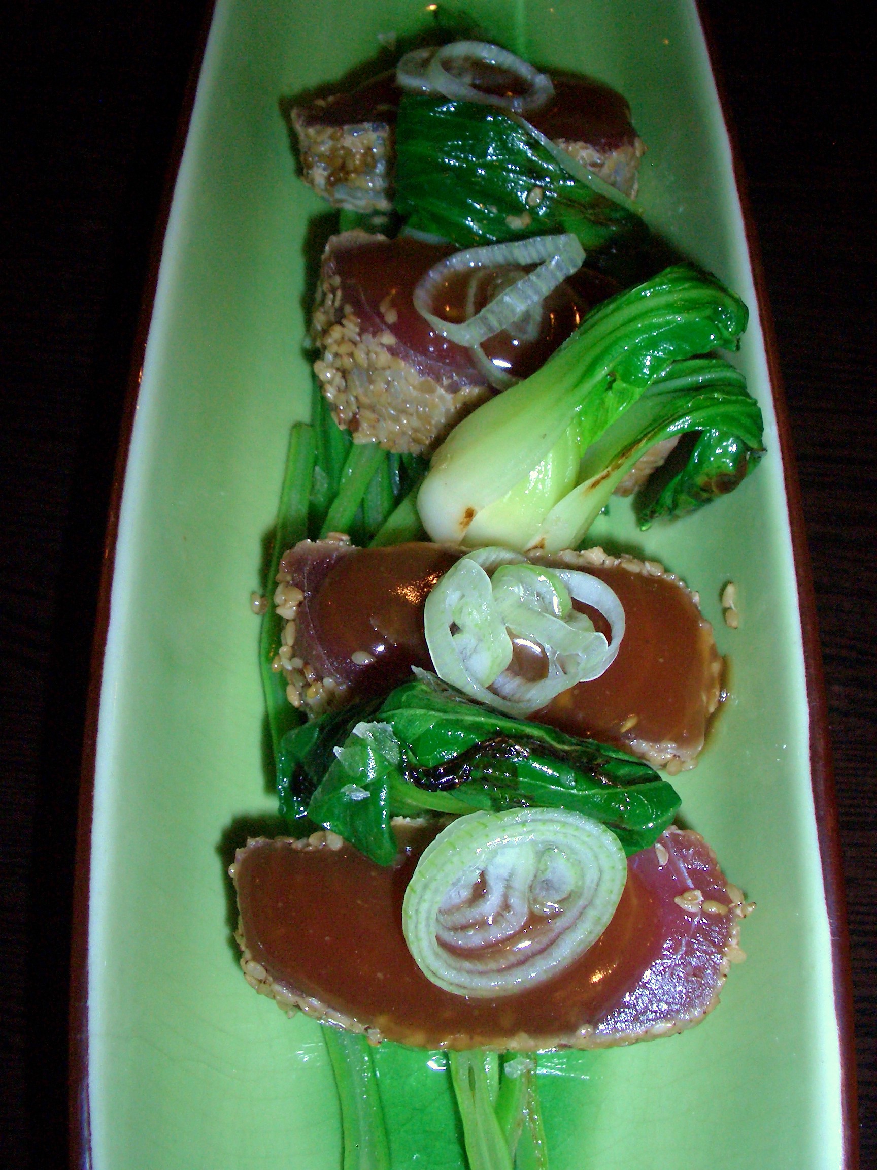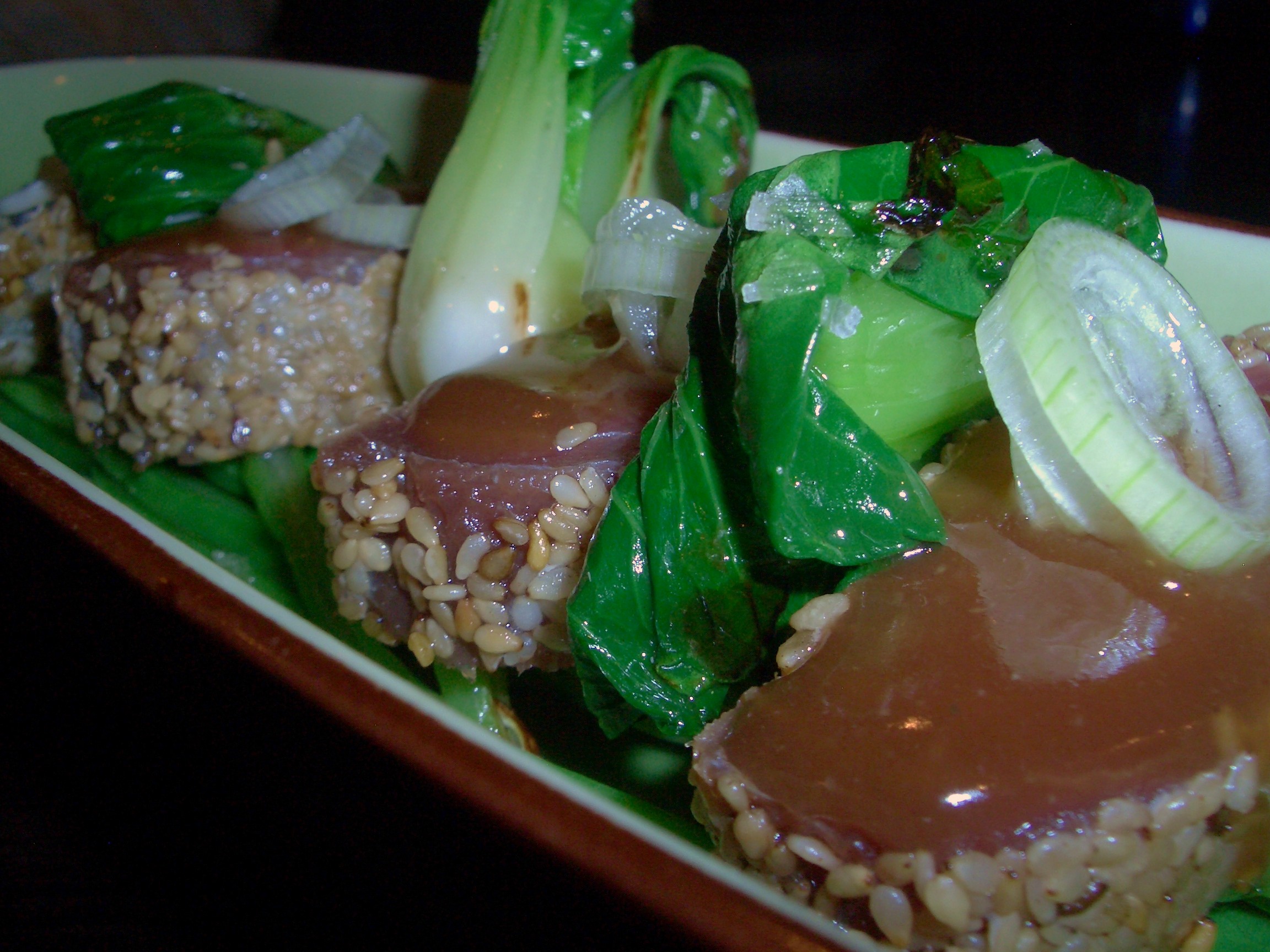 Rematamos con un tataki de atún rojo con salsa chifa, rebozado en sésamo sobre una base de judía verde y por encima cebolleta entre las piezas de atún una col china llamada pac choi rehogado con una salsa oriental especiada.