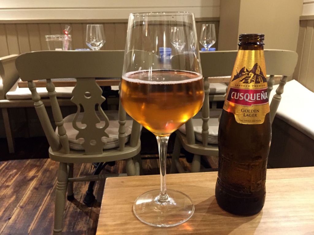 Para beber, me dejé sorprender por una de las cervezas típicas del Perú, la Cusqueña en sus versiones lager golden y dark. Me impactó sobre manera el sabor de la negra con claros sabores a malta tostada y toffee, dulce e intensa, con poca carbonatación y moderado amargor.