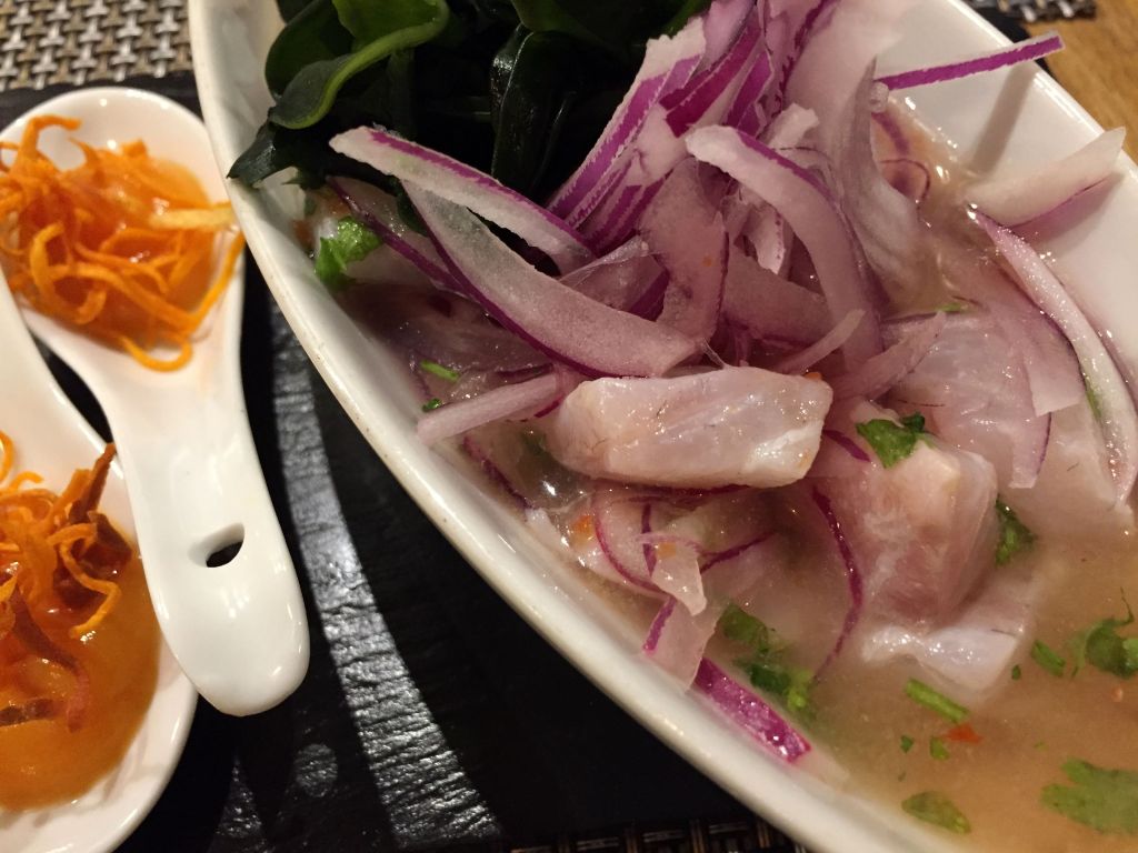 Turno del ceviche de corvina nikkei con puré de boniato. La corvina esta marinada con lima, jengibre, cilantro, aji limo y por supuesto su cebolla roja, se sirve acompañado de una cucharita con puré y crujiente de boniato para contrarrestar la acidez de la lima con el dulce del boniato.