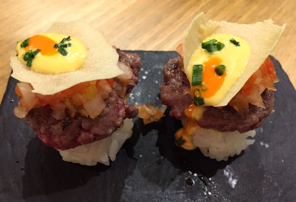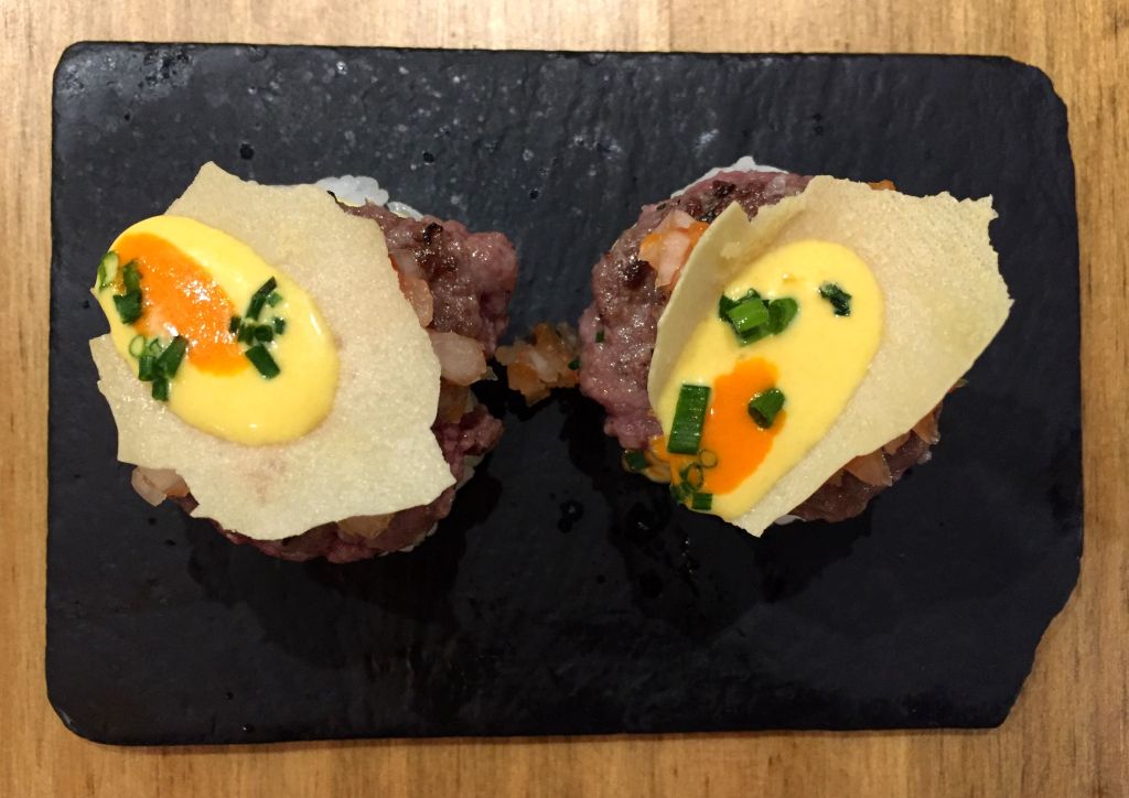 Seguimos con el niguiri de hamburguesa de wagyu, rocoto y azúl. Diferentes variedades de chiles, ajís, o pimientos picantes (para entendernos), realzan el sabor de esta exquisita carne.