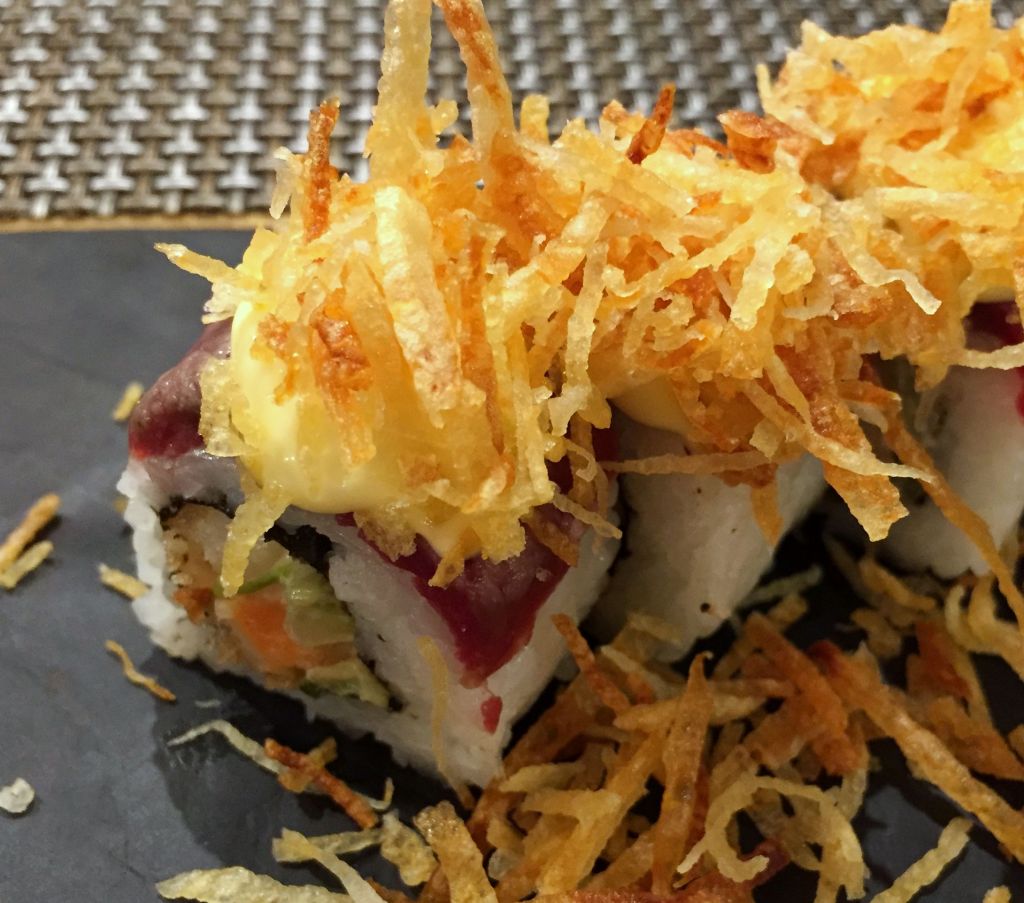 Seguidamente unos roll, tienen el arroz por fuera y el alga por dentro, en este caso tomamos dos variantes, los de Mar y Montaña que tienen por la parte exterior la carne roja y por dentro el langostino y con un crujiente de patata.