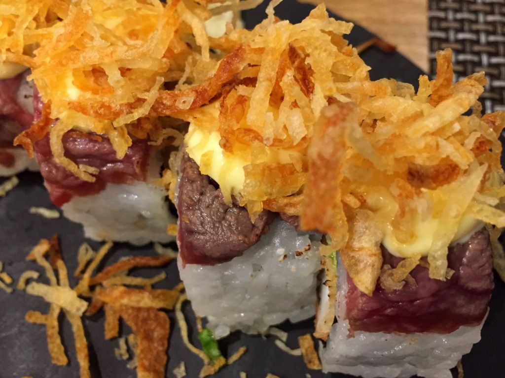El roll de mar y montaña tampoco podía faltar, esta combinación donde el langostino va envuelto en su interior con el alga nori, corona el arroz con un fino trozo de carne roja.