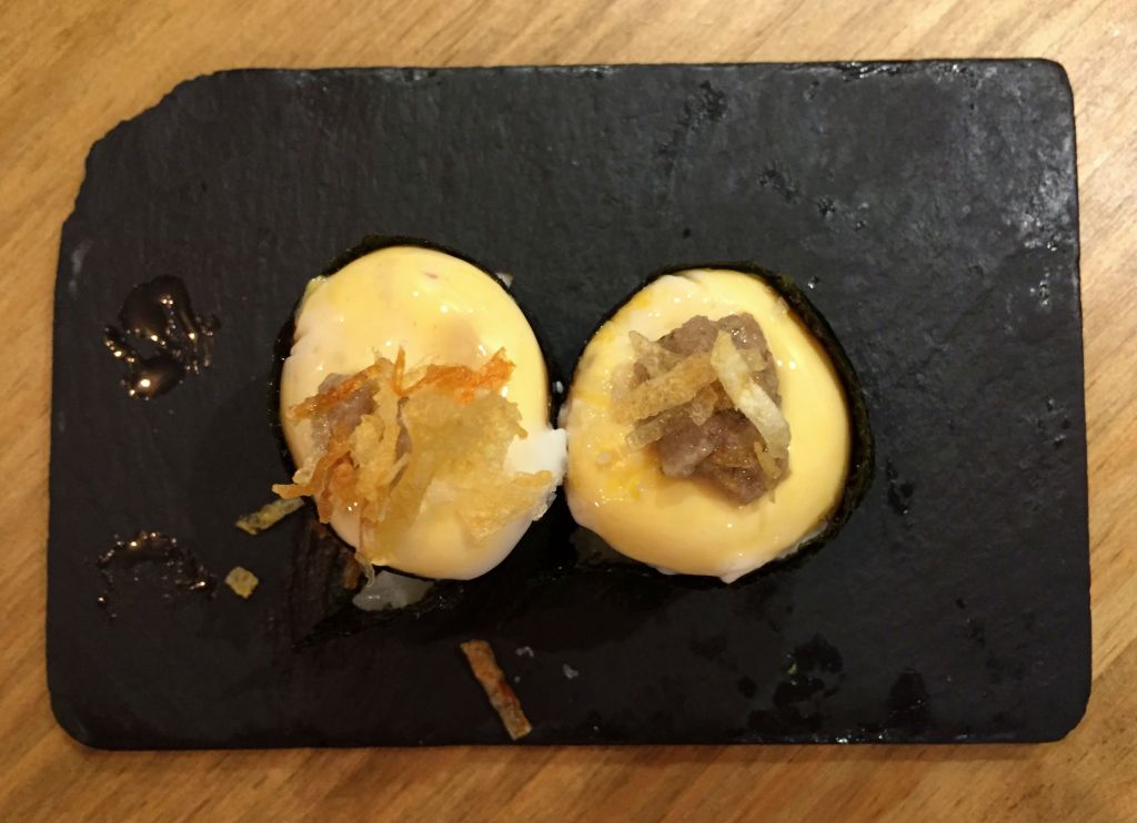 El gunkan de huevo trufado nunca lo había probado y me encantó su explosión en boca, mezclado con la potencia de la pasta de trufa blanca.
