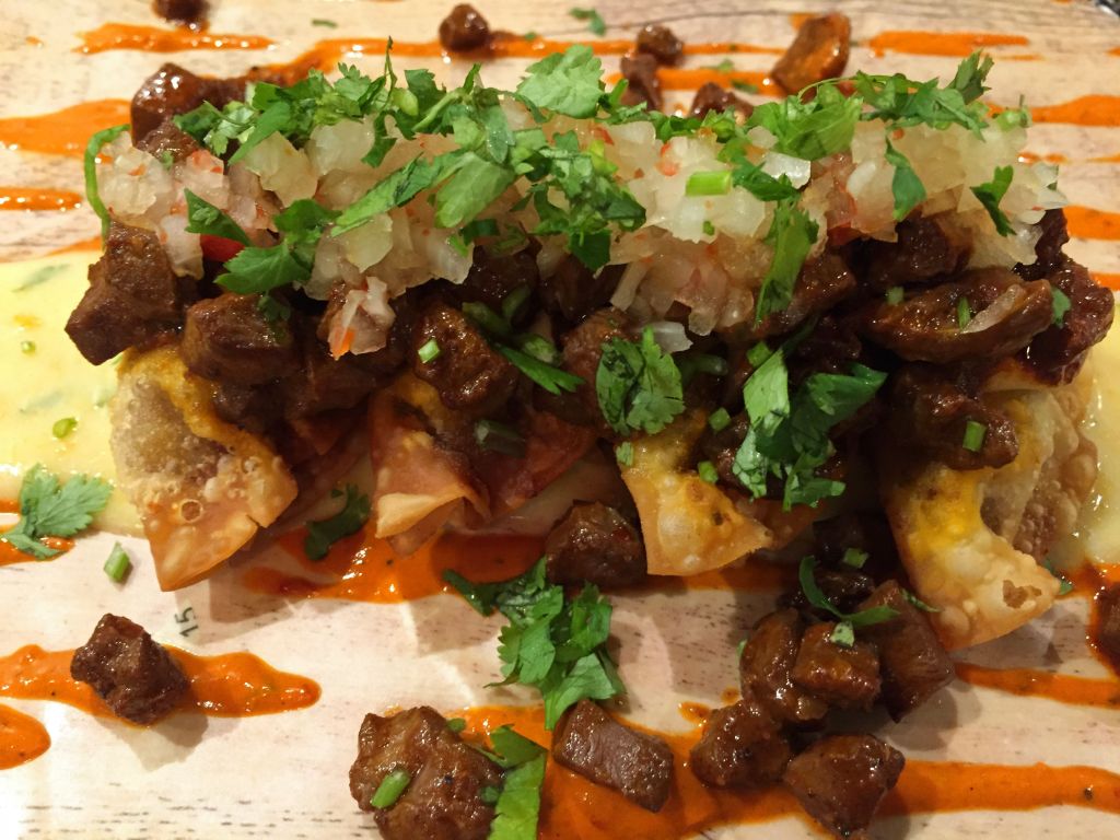 Las gyozas criollas de ternera y manitas de cerdo, elaboradas con harina de maíz, rellenas de estos ingredientes y coronadas con los mismos en versión crujiente.