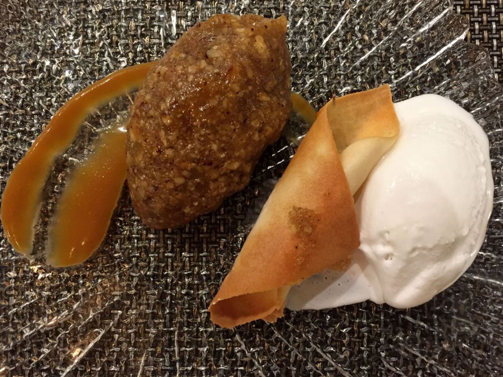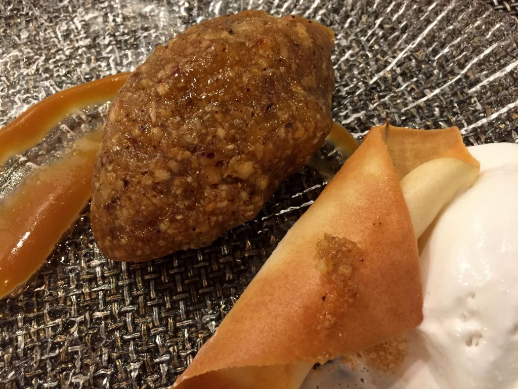 La otra elección fue el bizcocho roto de avellanas con helado de coco, toffee y crujiente de galleta. El relleno de avellanas va templado para contrastar con el helado. Otra buena elección, sin duda alguna.