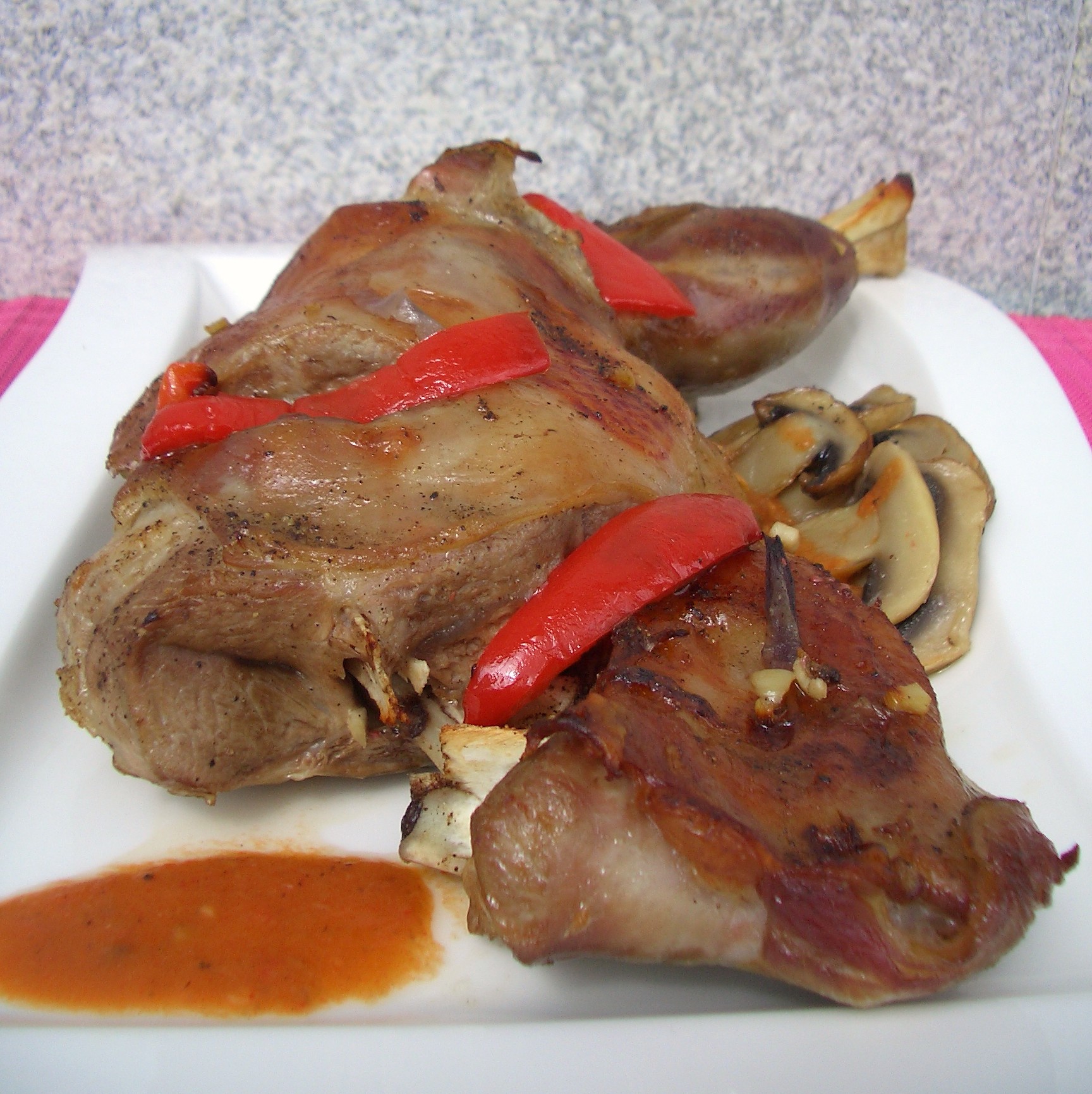 Introducimos en el horno que habremos precalentado a unos 200º,  bajamos a 180º y esperamos a que se dore la piel, de vez en cuando con una cuchara le echaremos el caldo por  encima para que hidrate bien, en una de estas incursiones le agregamos pimienta recién molida. Cuando este dorado le daremos la vuelta y volveremos a remojar con el caldo. Añadimos un chorro generoso de vino blanco, cuando veamos que ha evaporado la mayor parte de los jugos le volvemos a dar la vuelta para rematar la piel y que nos quede crujiente.CIMG3354