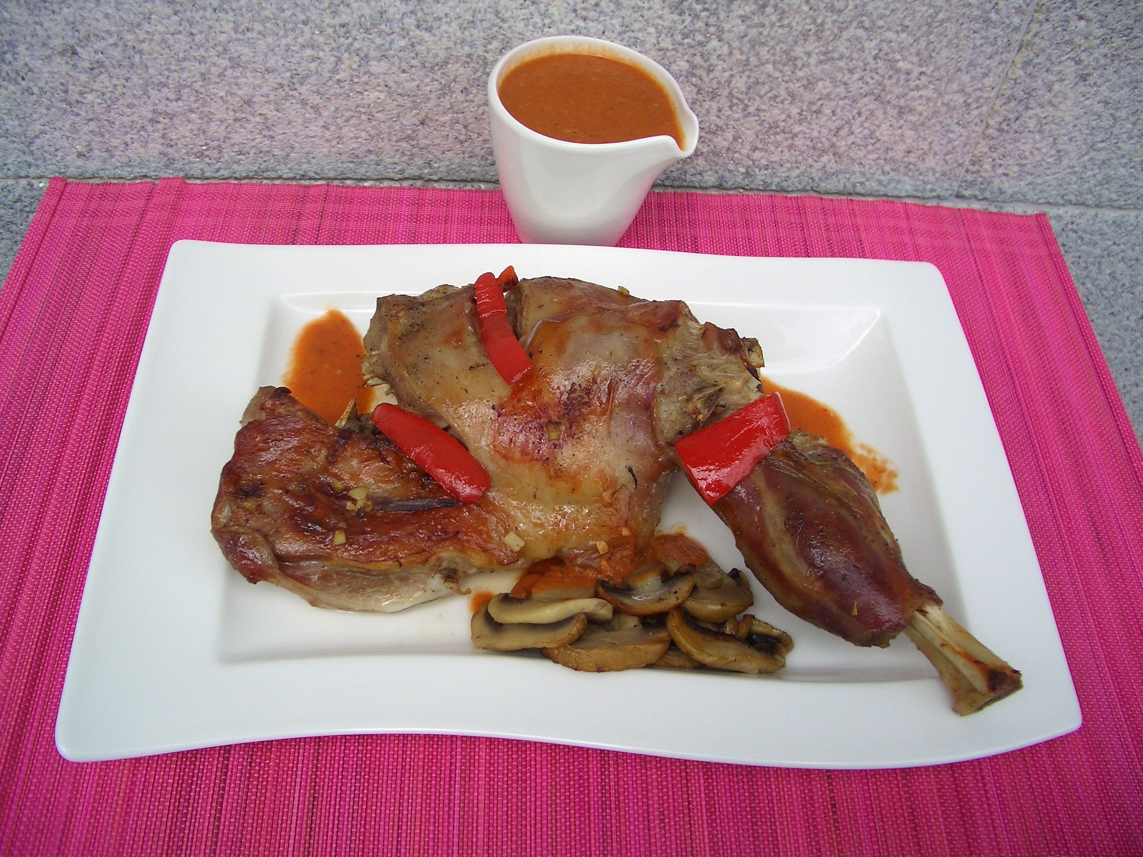 En el plato que vayamos a presentar colocamos la paletilla limpia, adornamos con algunos champiñones y el resto de la salsa y verduras las trituraremos para obtener una salsa espesa que serviremos a parte, podemos rectificar de sal y pimienta al gusto. Podemos acompañarlo de unas patatas fritas, unas panadera que podemos hacer al mismo tiempo en la fuente con el cordero y las verduras, con una ensalada o sólo,que fue mi elección.