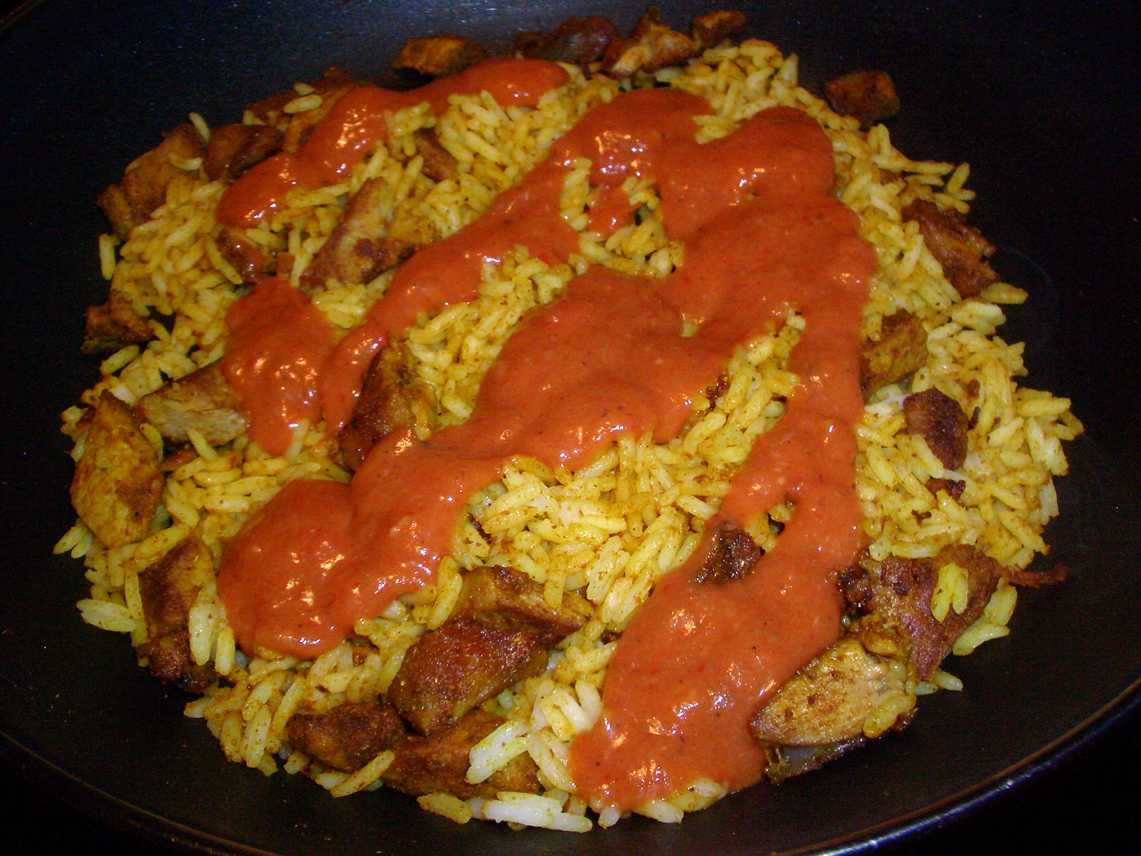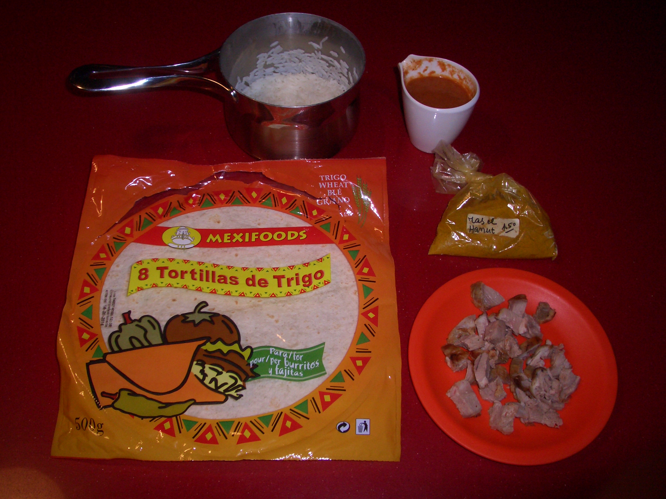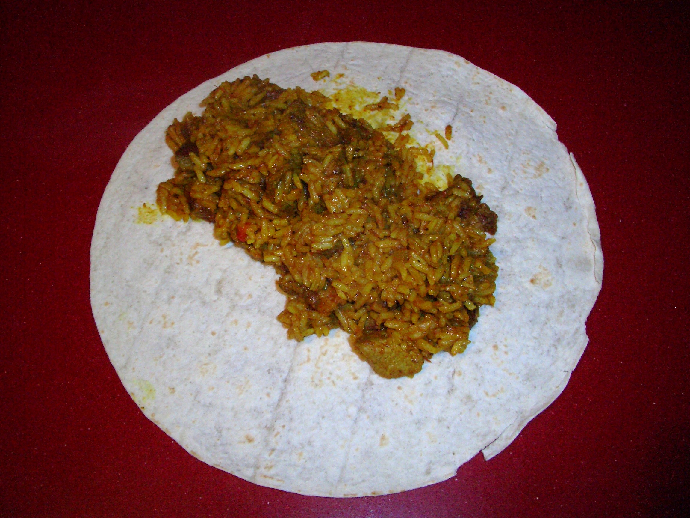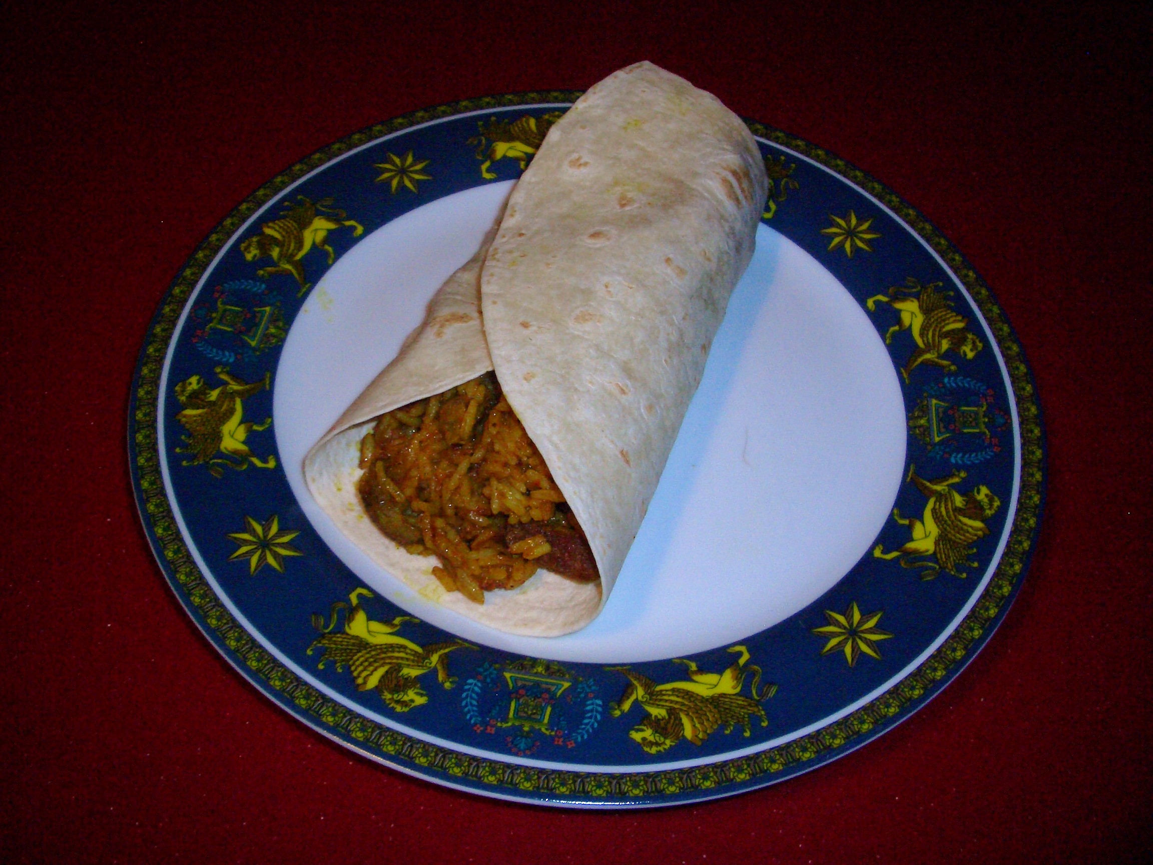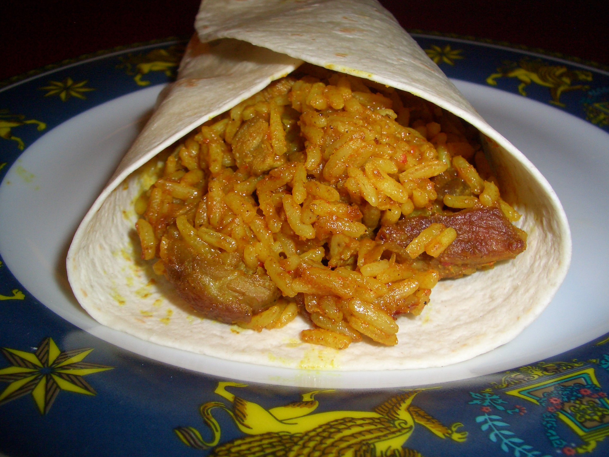 1 tortilla de trigo, cordero, arroz, ras al hanut, salsa y aceite de oliva.