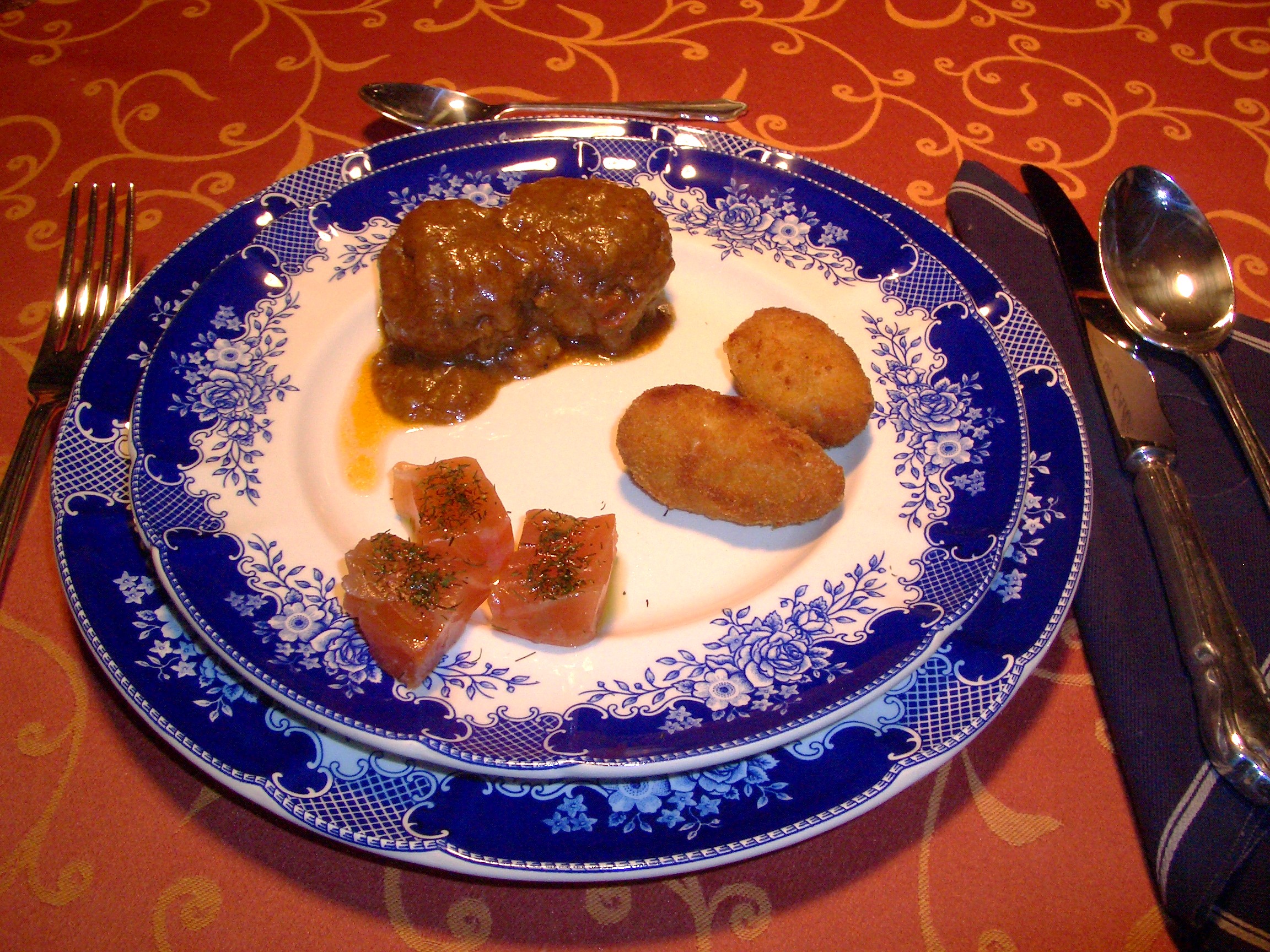 Comenzamos con un plato de entremeses frios y calientes, a saber: croquetas de jamón, salmón fresco marinado y unas albóndigas de merluza. Todos y cada uno de ellos estaban muy buenos pero destaco esas albóndigas, toda una delicatessen.
