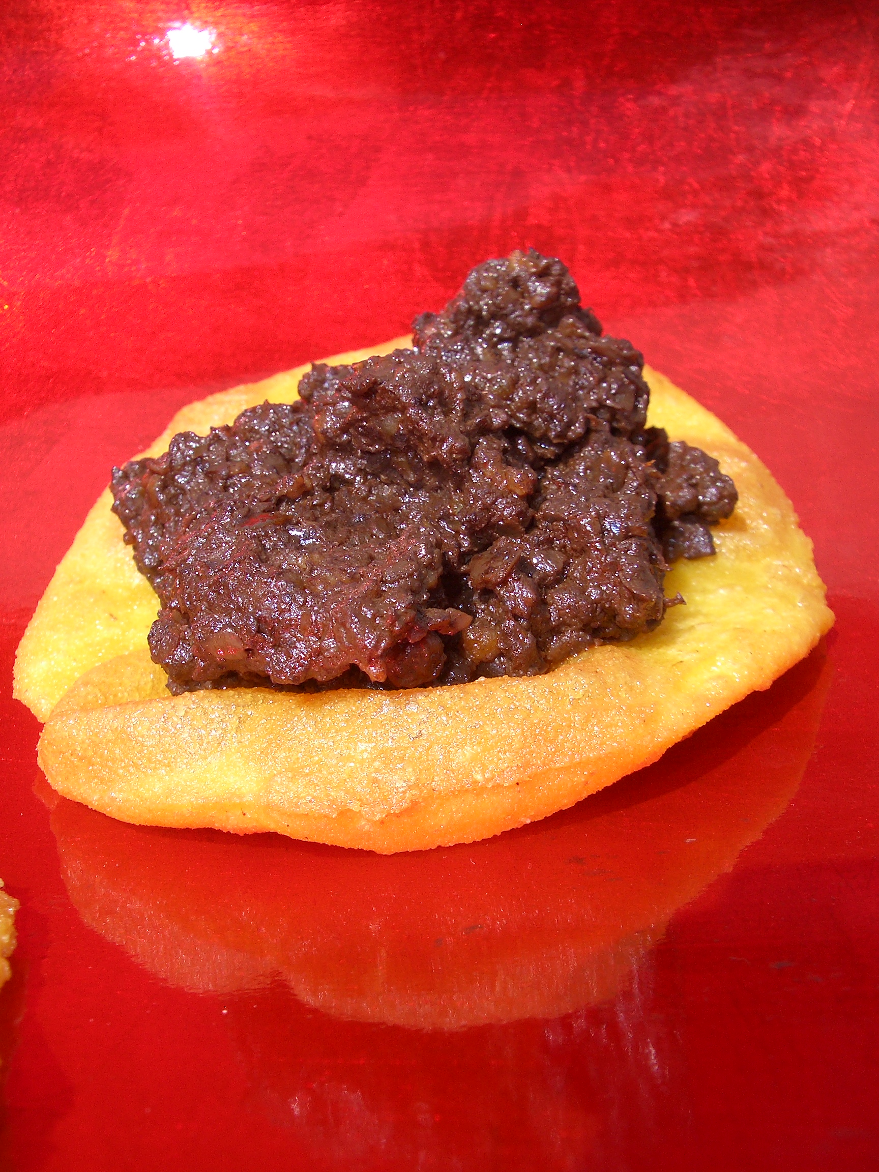Preparamos el resto de complementos, en este caso freír la morcilla, el picadillo y el huevo, cada uno por separado y con aceites nuevos para cada uno. Emplatamos colocando encima del torto.