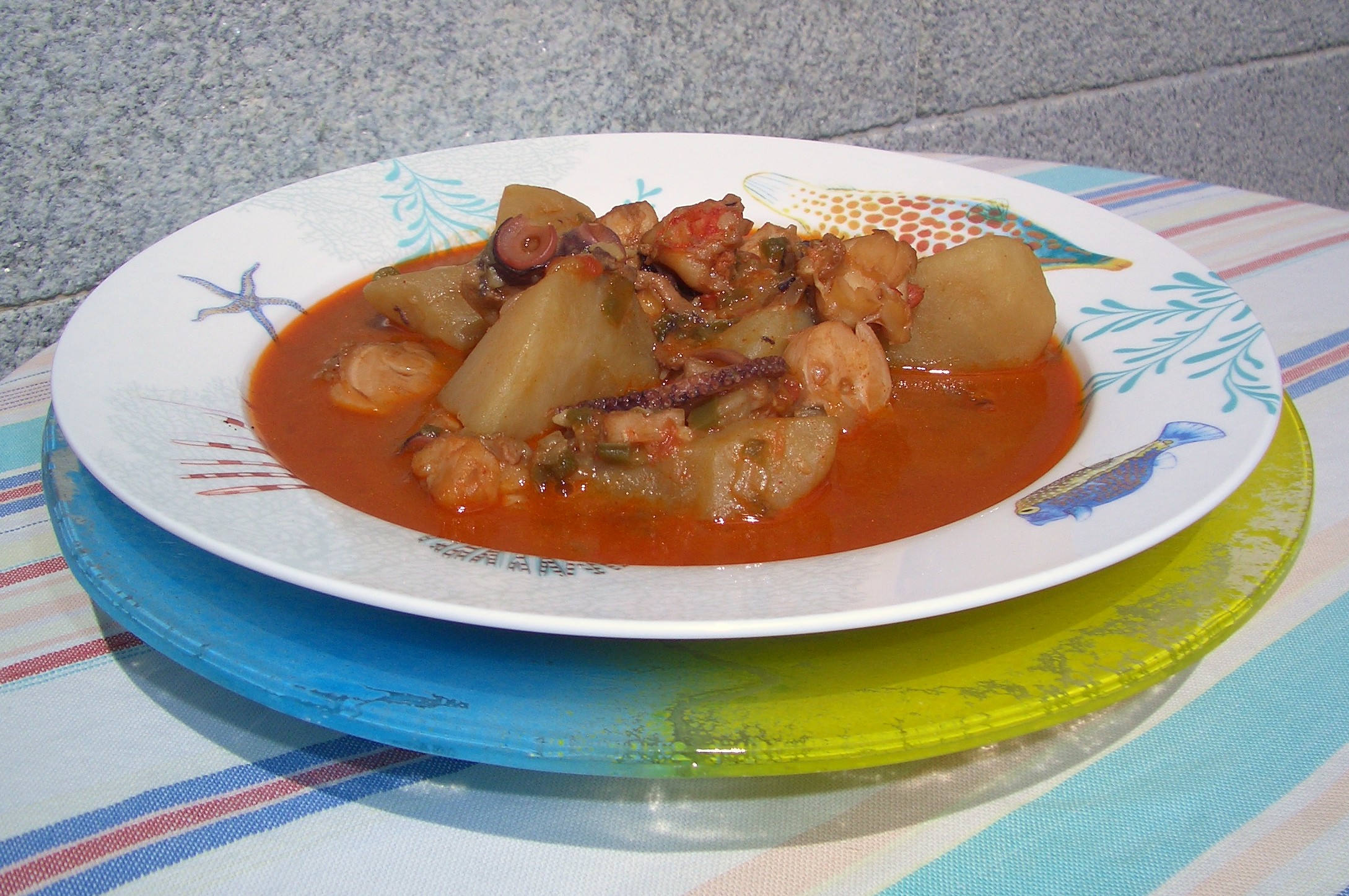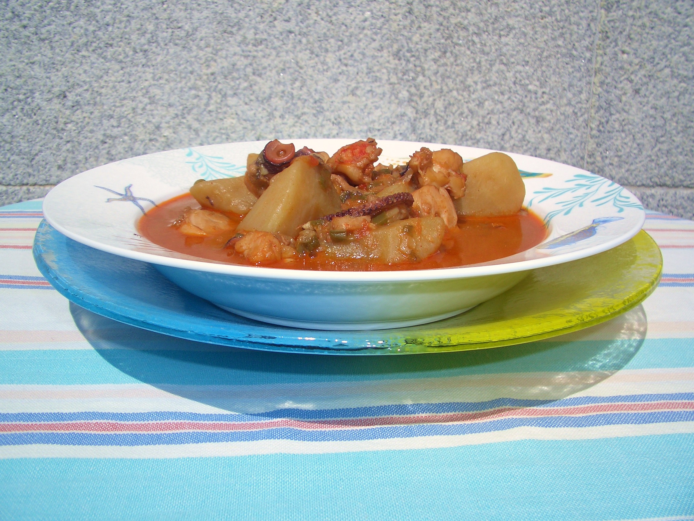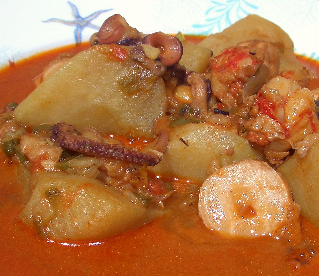 Pulpo cocido (tanto como queramos, para 2 raciones fue suficiente con los dos tentáculos), 6 langostinos grandes, 3 dientes de ajo, 1 cebolla, 1 pimiento verde, 1 tomate, 2 cucharillas de café de pimentón picante (podéis hacer una y una mezclando el dulce), 3 patatas grandes, aceite de oliva y sal.