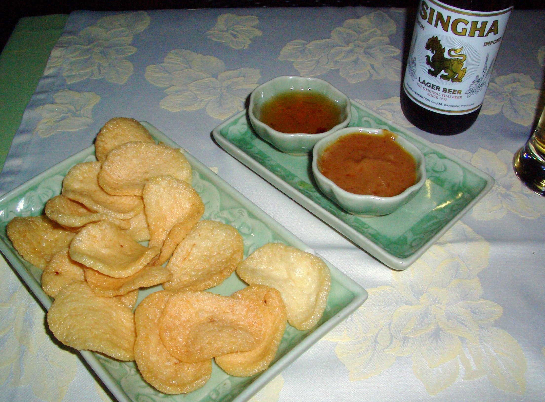 Estamos en Semana Santa y la temperatura nocturna es muy buena para alguien llegado del norte así que cenar en la terraza es un imperativo y mucho más siendo nuestro último día en el paraíso. Resulta obligado tomar el aperitivo con una cerveza Shinga bien fría que nos acompañan con un pan de gambas y sus salsas de cacahuete y otra tipo miel.