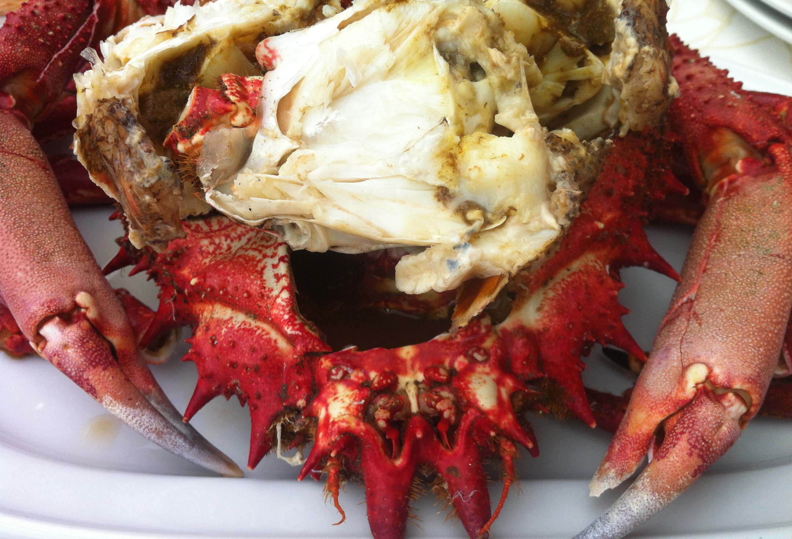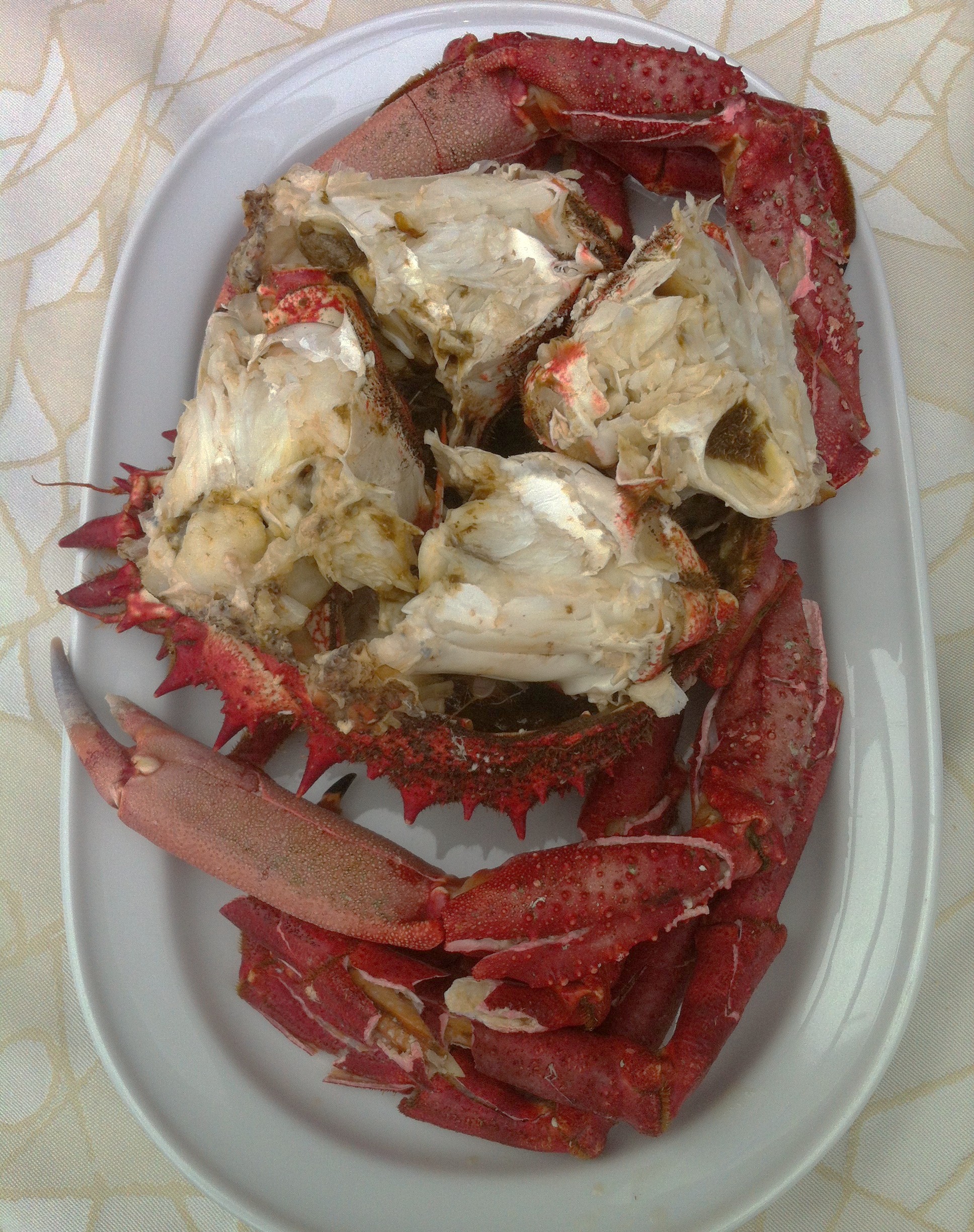 El primero en llegar fue el centollo, un buen ejemplar de 1,5kgs, muy fresco y sabroso, vaya diferencia con los que compro de importación en el supermercado aunque cada cosa en su sitio, ya os comente que esos franceses están bastante bien, sin demasiadas pretensiones, como único objetivo de entretenimiento y beber una botella de sidra. Este es otra cosa, calidad, potencia de sabor…..vamos un centollo como Dios manda.