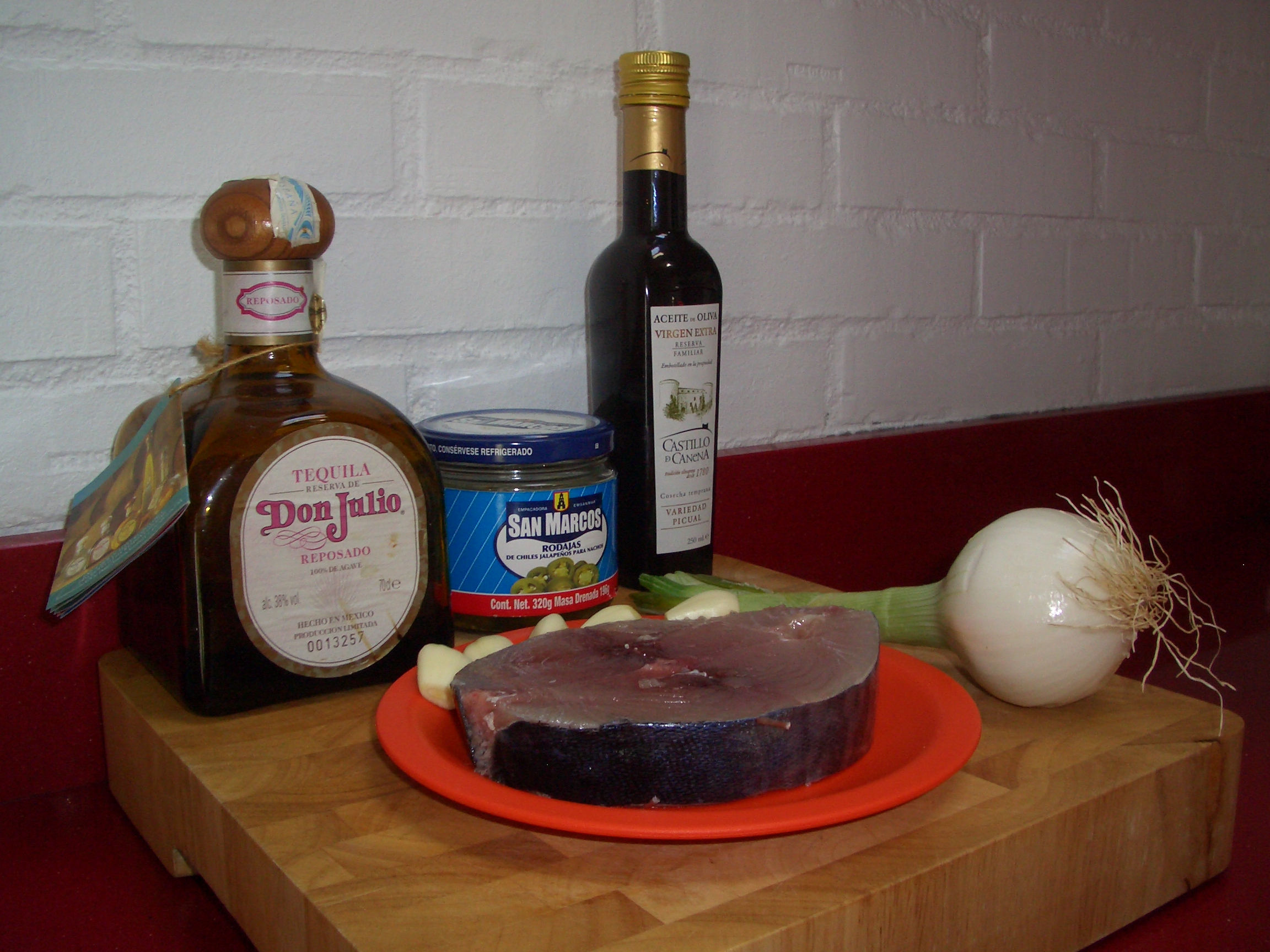 1 rodaja grande y gruesa de bonito del norte, 1 cebolleta, 5 dientes de ajo, jalapeños en rodajas, un chorro generoso de buen tequila, aceite de oliva y sal.