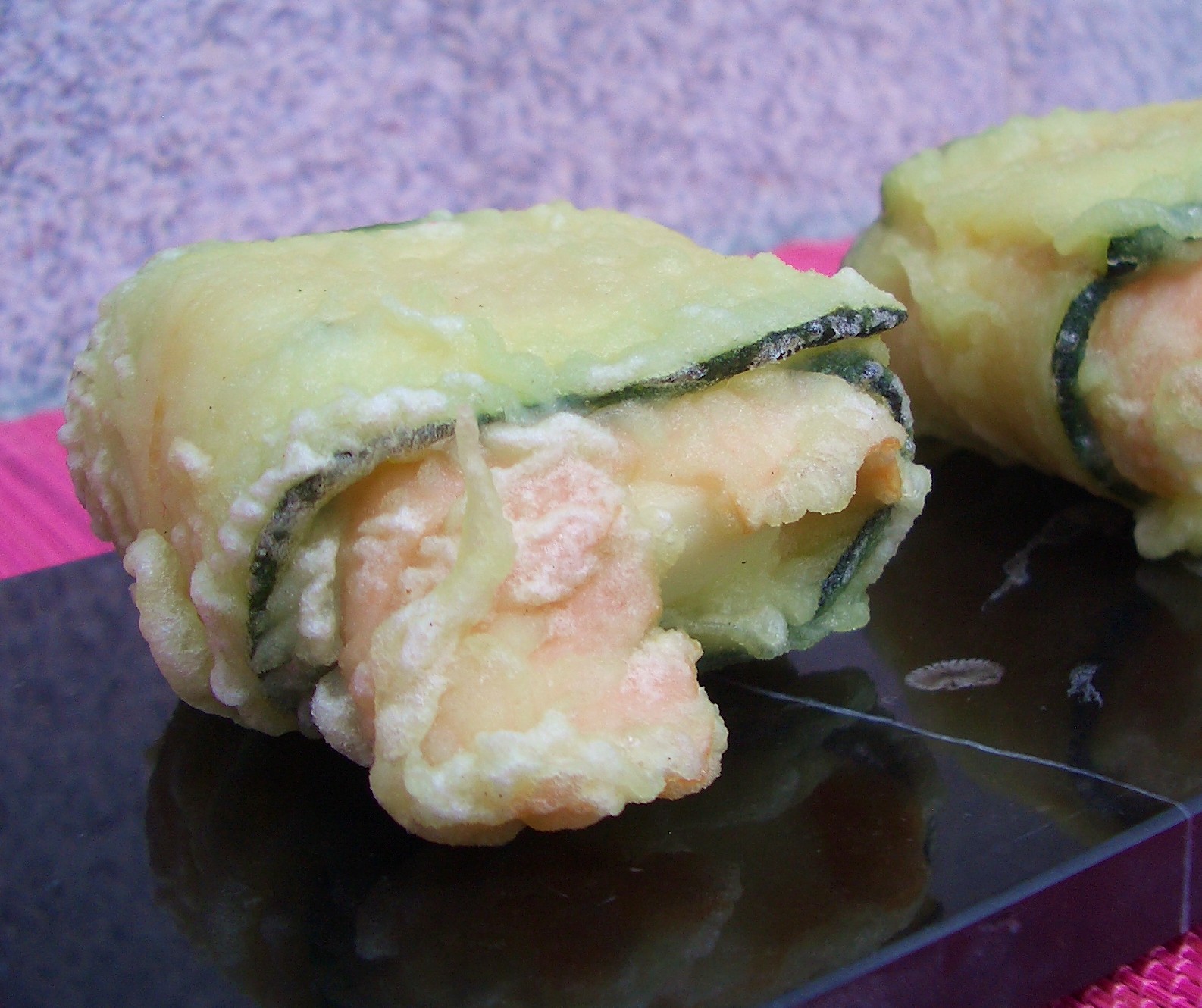 1 huevo cocido, 20grs de cangrejo real (podéis sustituir por bonito, andarica, centollo..etc), una cuchara de postre de mayonesa, 4 tiras finas de calabacín, 50grs de salmón ahumado, harina de tempura, agua muy fría.