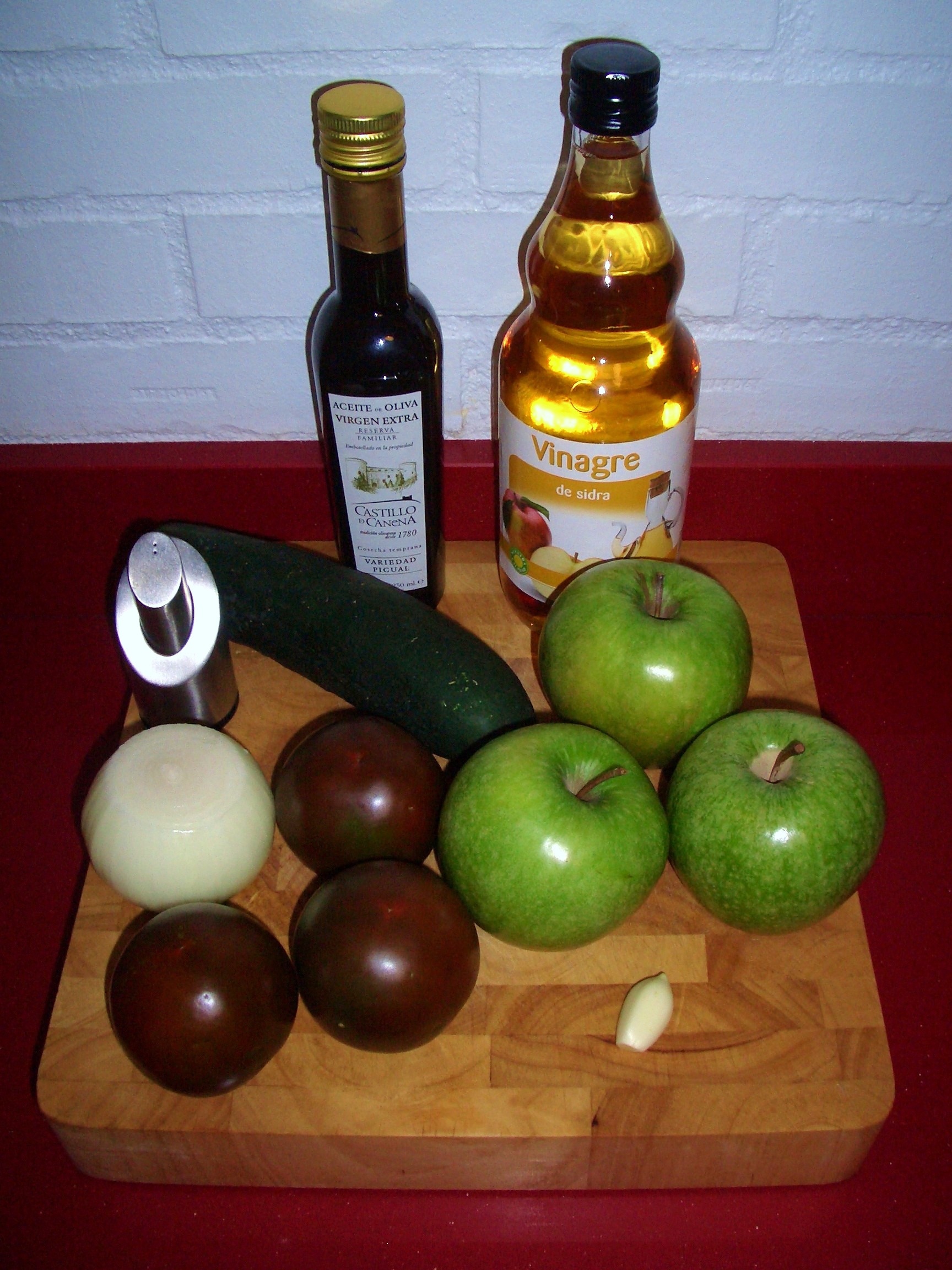 3 manzanas verdes, 3 tomates kumato, 1/2 cebolla, 1/2 pepino, 1 diente de ajo, vinagre de sidra, aceite de oliva y sal.