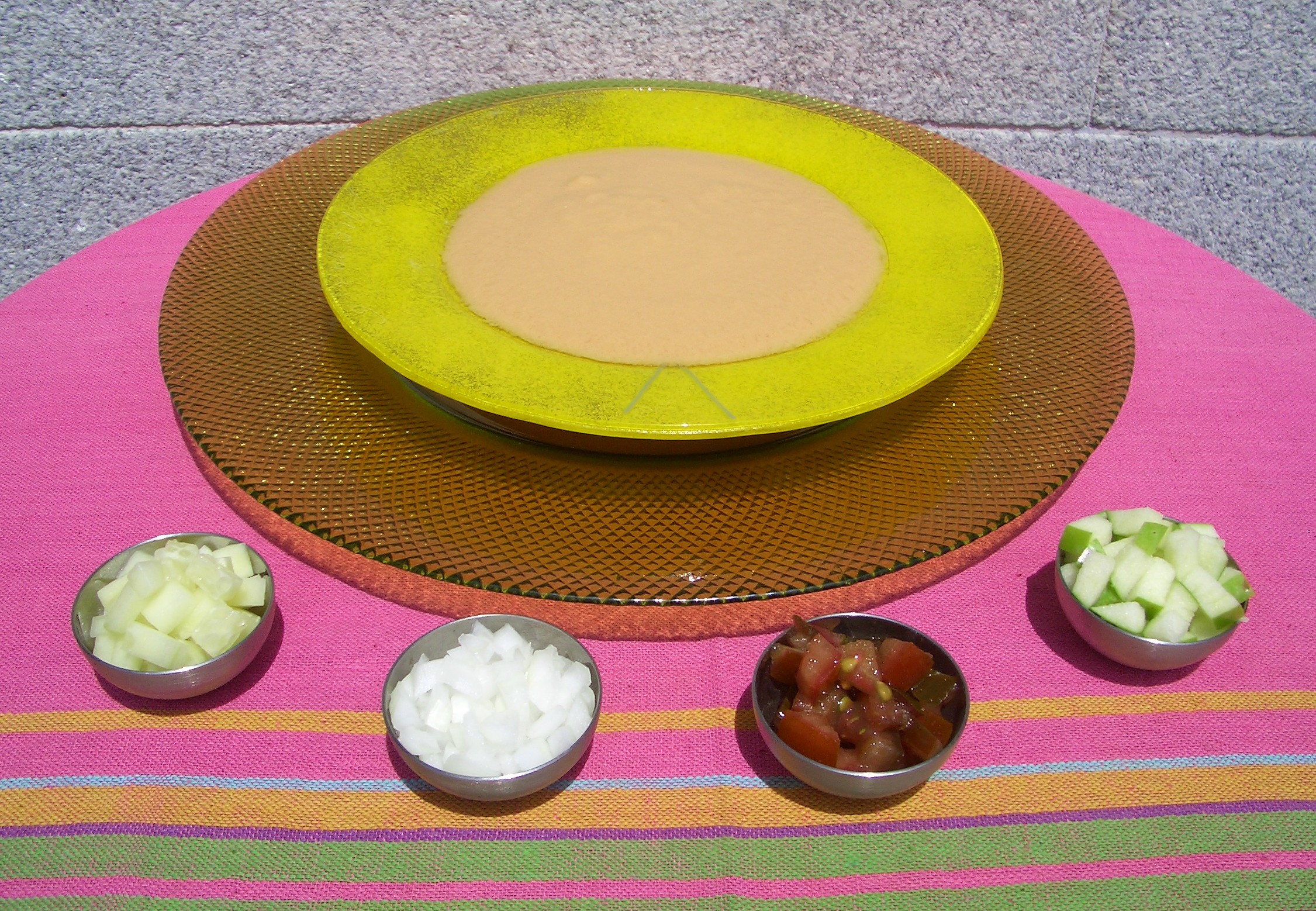 Como ya comente en otros gazpachos prefiero no dar medidas, ir probando poco a poco y según os guste. Cuando consigáis el sabor deseado colaremos con un chino (más sencillo que con un colador). Refrigeramos hasta la hora de consumir y acompañamos con unos tropezones.