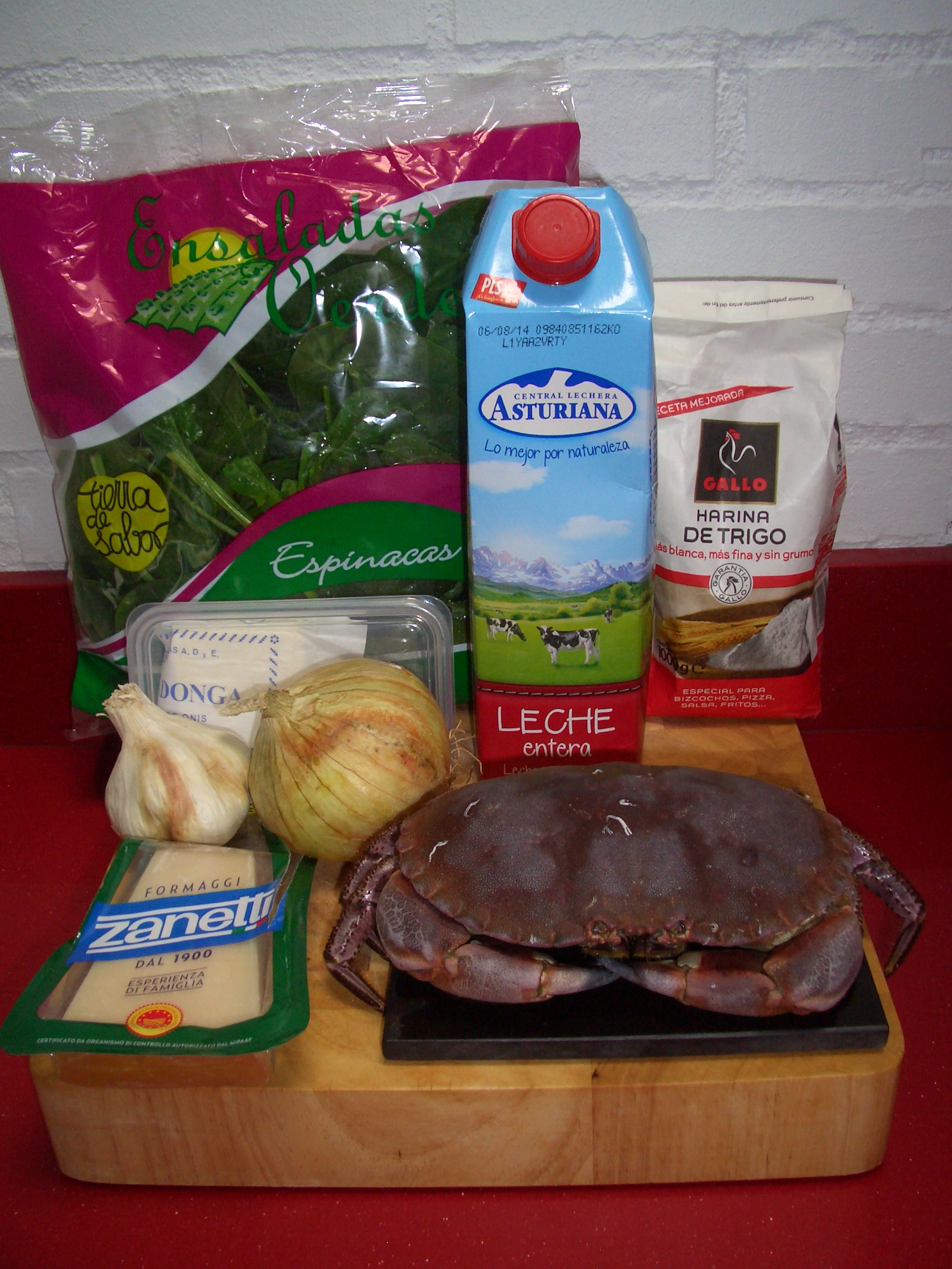 1 ñocla, 1 bolsa de espinacas naturales, 1 cebolla, 4 dientes de ajo, 1 chorro de vino blanco, mantequilla, harina, leche, queso rallado, 2 huevos, pan rallado, aceite de oliva y sal.