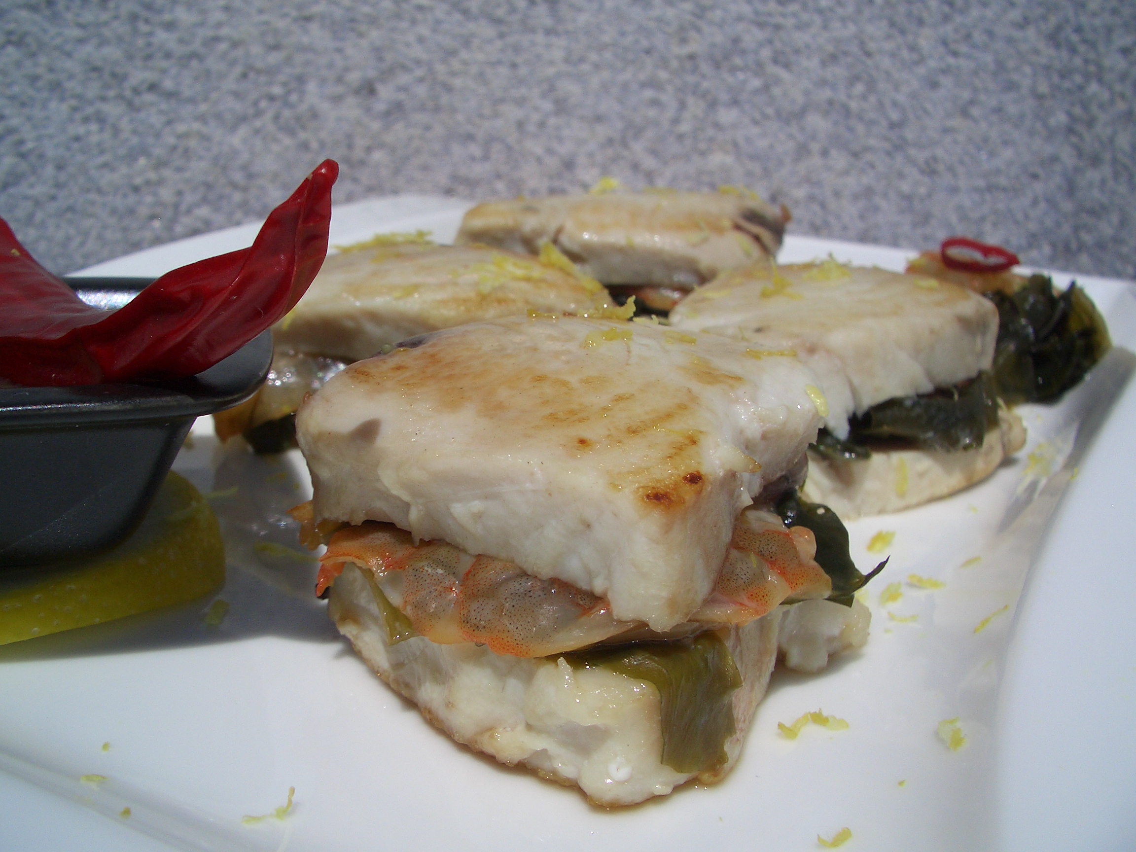En una sarten con muy poco aceite marcamos el bonito que previamente habremos salado, con cuidado los partimos a la mitad y rellenamos con las algas y los langostinos.