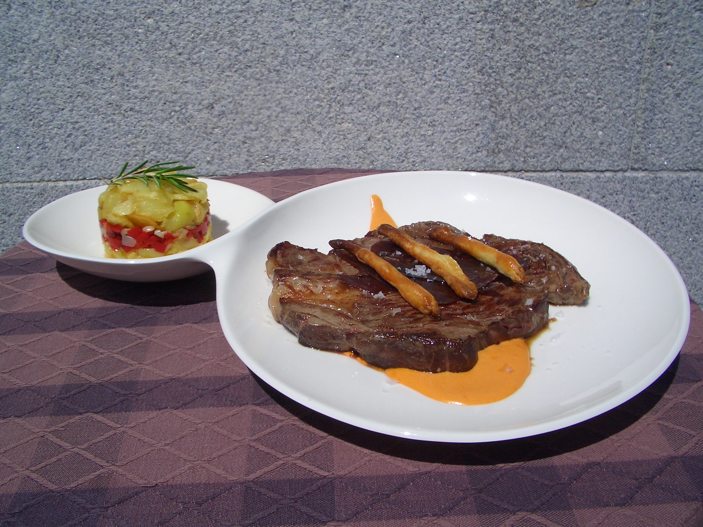 Montamos el plato. Con la ayuda de un aro colocamos una capa de patata, en medio una con la cebolla y pimiento y rematamos con otra de patata decorando con una ramita de romero. En la base del plato con un cucharón hacemos una gran lágrima con la crema de sobrasada, colocamos con cuidado el entrecot encima, unas lonchas pequeñas de cecina, los palitos de hojaldre, unas gotas del aceite de trufa y esparcimos la sal en escamas.