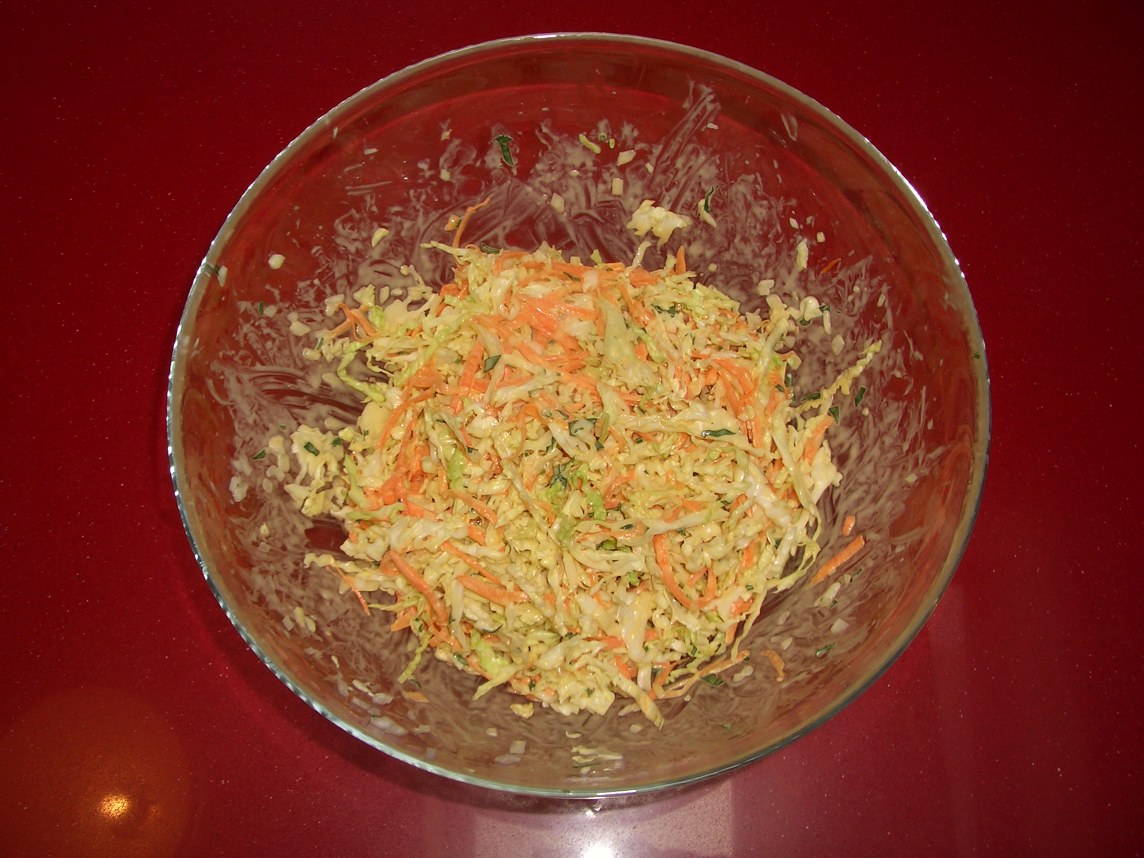 Para acompañar el plato se hace con una ensalada coleslaw, esa que os encontrareis en los restaurantes de comida rápida, está hecha a base de repollo y zanahoria con una salsa bastante sencilla pero que tiene que estar bastante equilibrada. Hoy no me extenderé con su receta, la almaceno para otra ocasión  que esto no es el 2×1 de las rebajas.