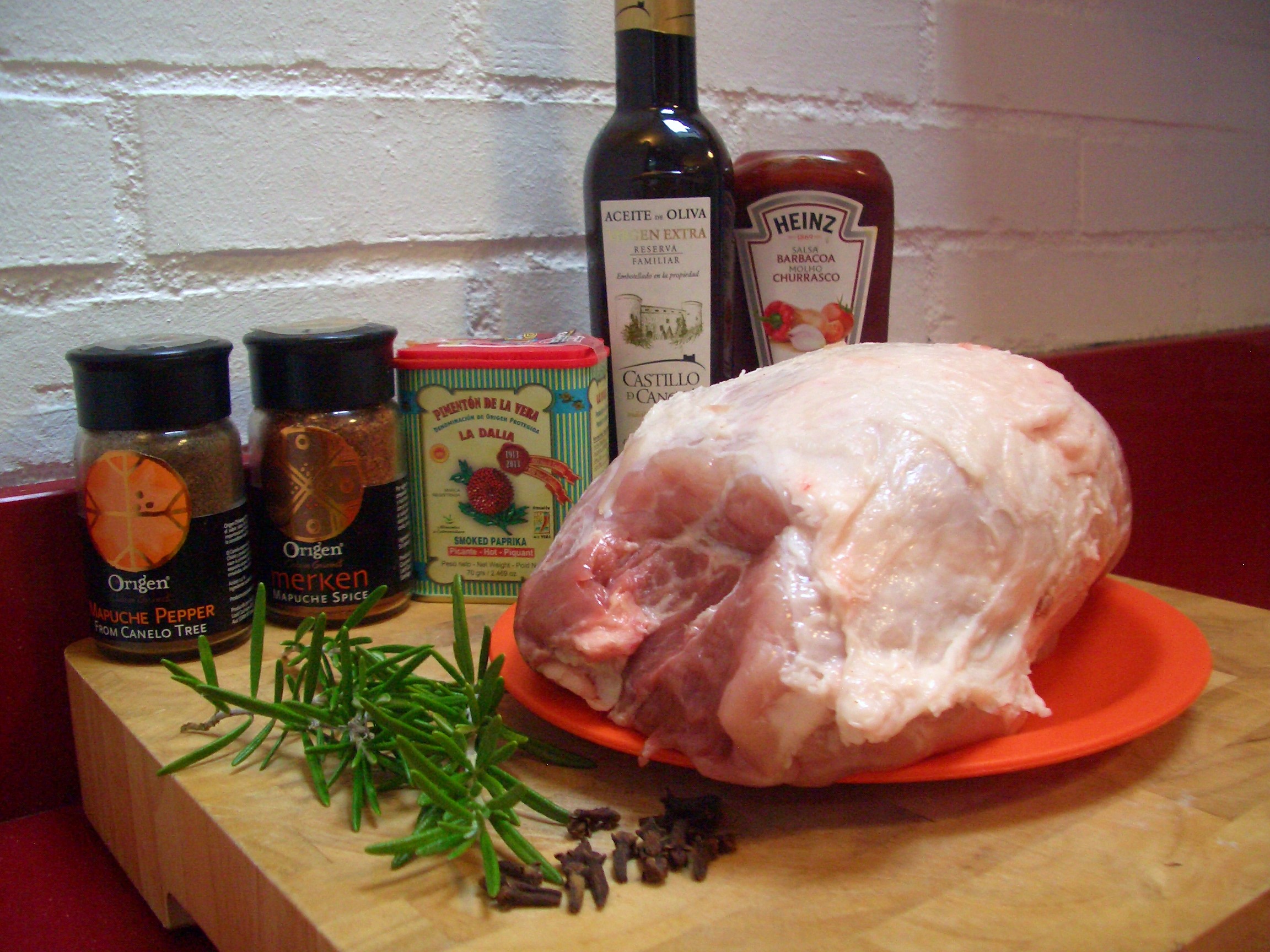 ¿Que es el pork shoulder?, concretamente hablaríamos del corte del cerdo llamado presa. Estamos habituados a comerla en filetes y si es de cerdo ibérico es un auténtico manjar pero aquí se trataba de conseguir la pieza entera, fue misión imposible, incluso en el Hipercor, no venden esa parte en pieza grande por lo que me tuve que conformar con la babilla que es la parte que se encuentra en la pierna trasera del cerdo, que va desde el codillo a la cadera, una pieza sin hueso y magra, no tan jugosa como la presa pero hay que adaptarse a las circunstancias.